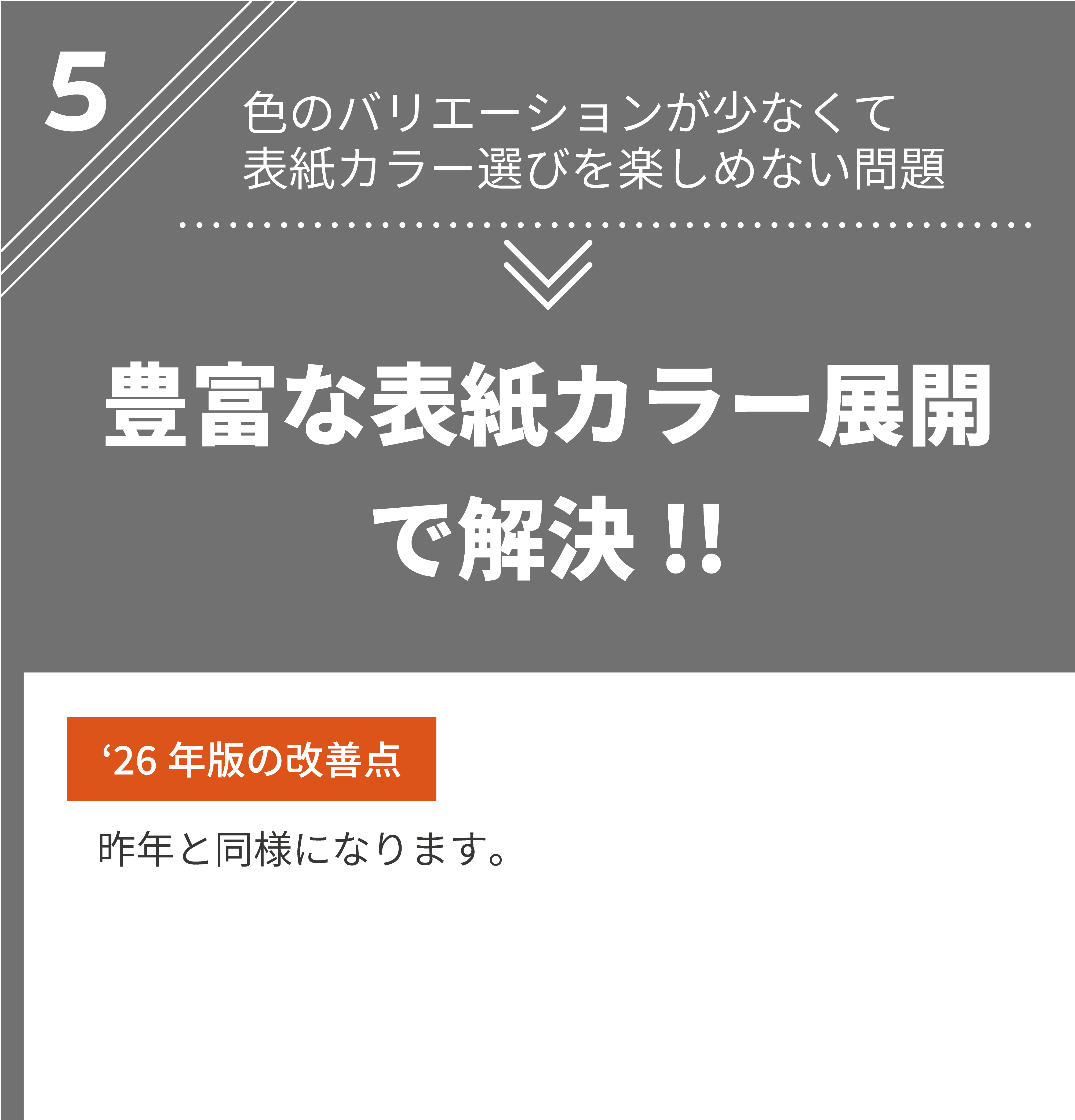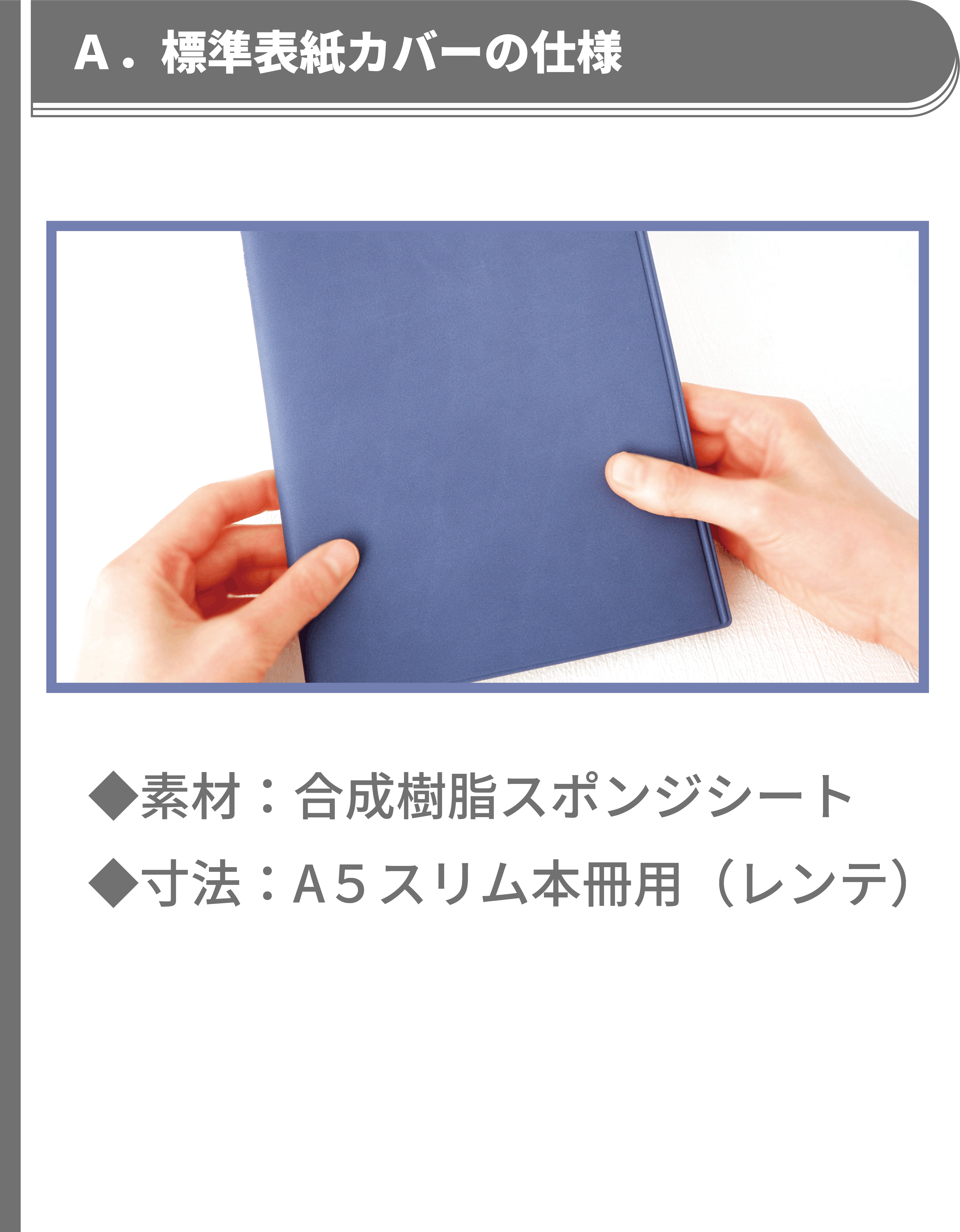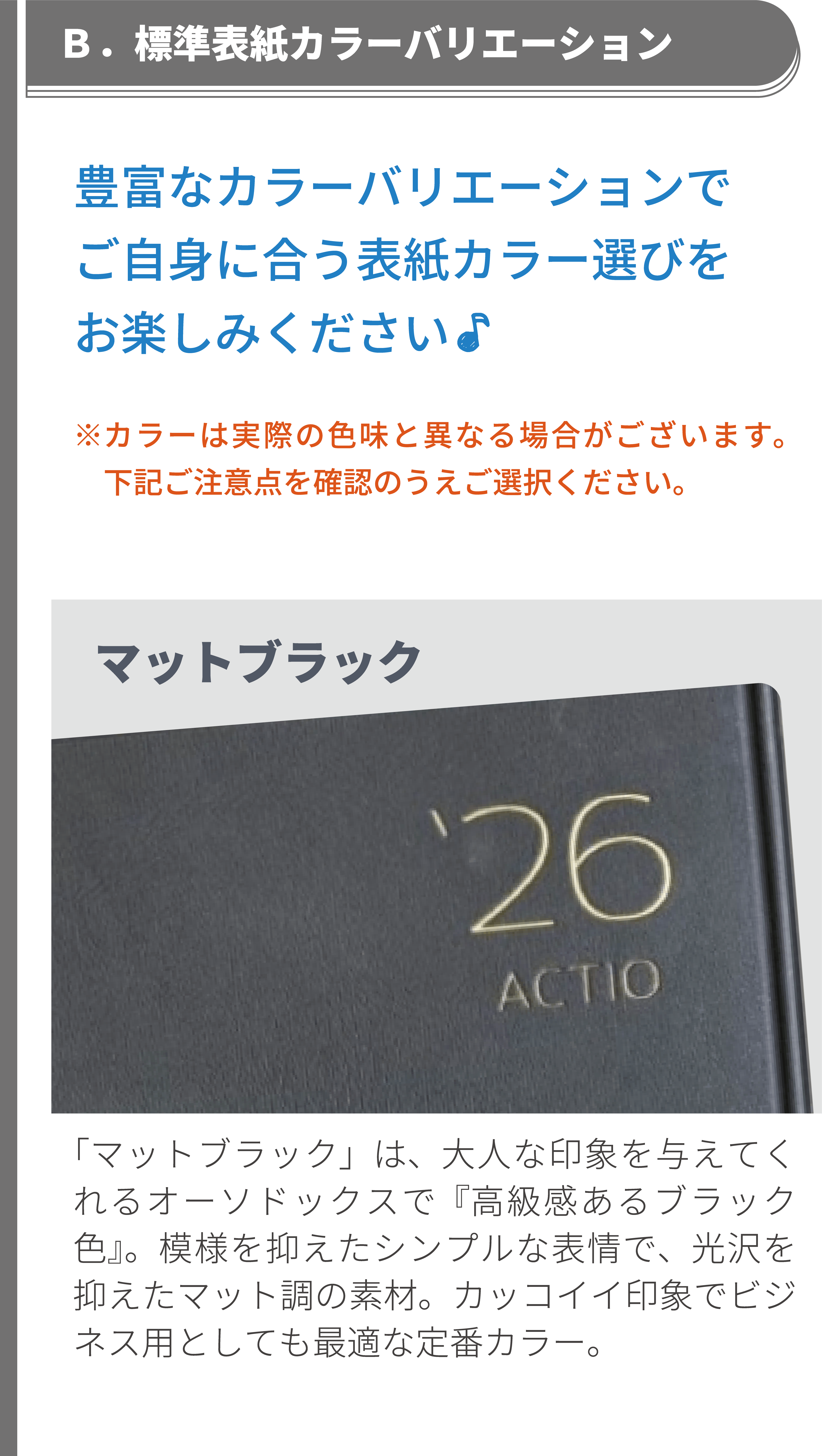 表紙の素材カバー(合成樹脂)は、カラーによって選定素材が異なるため、シボの入り方や手触りも異なります。上記の表紙画像および説明にてご確認をお願いいたします。 また、表紙カラーの色味は、デバイス画面上では実際の色味と異なる見え方をする傾向にあります。そのため、デバイス上でご覧になった印象と実際お手元でご覧になった色味の印象が異なる場合がございます。室外光や室内光、室内光でも照明の寒色系・暖色系によっても見え方が異なります。予めご了承ください。