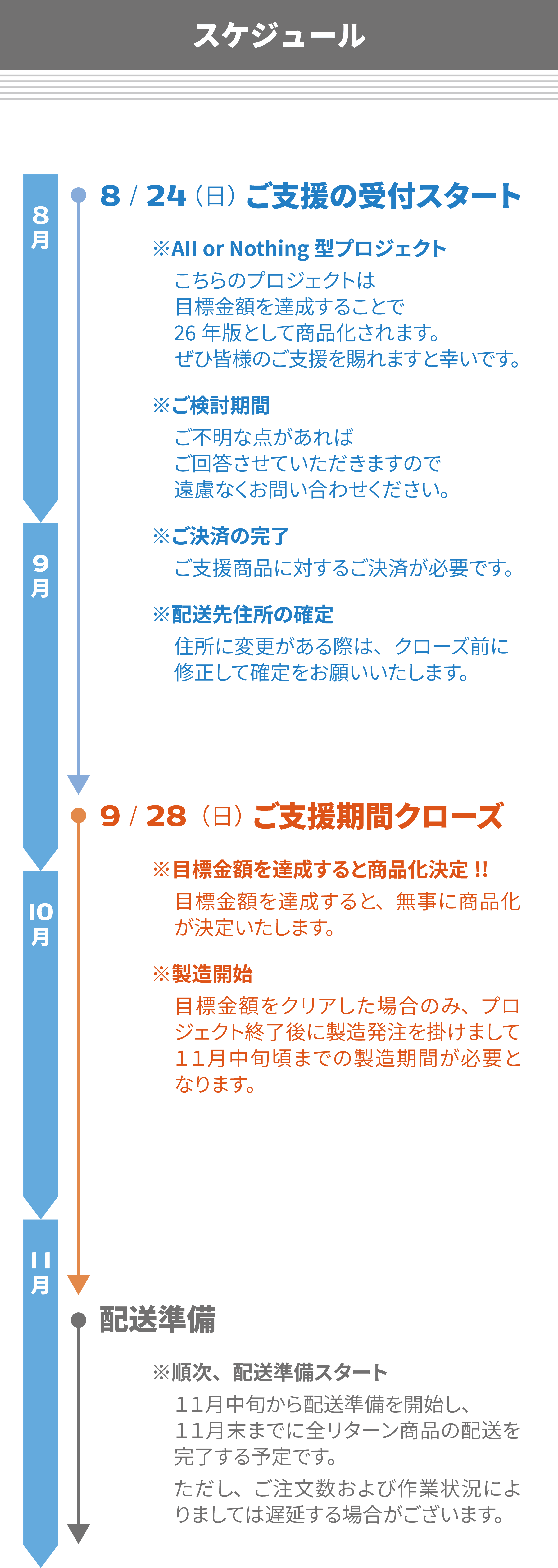 本文中に記載させていただいたスケジュールは、あくまでプロジェクト公開時点の予定です。 ご支援の性質上、ご注文が集中する等の状況によりましては、発送遅延の可能性があります。その際は、活動報告にてお知らせをさせていただきます。