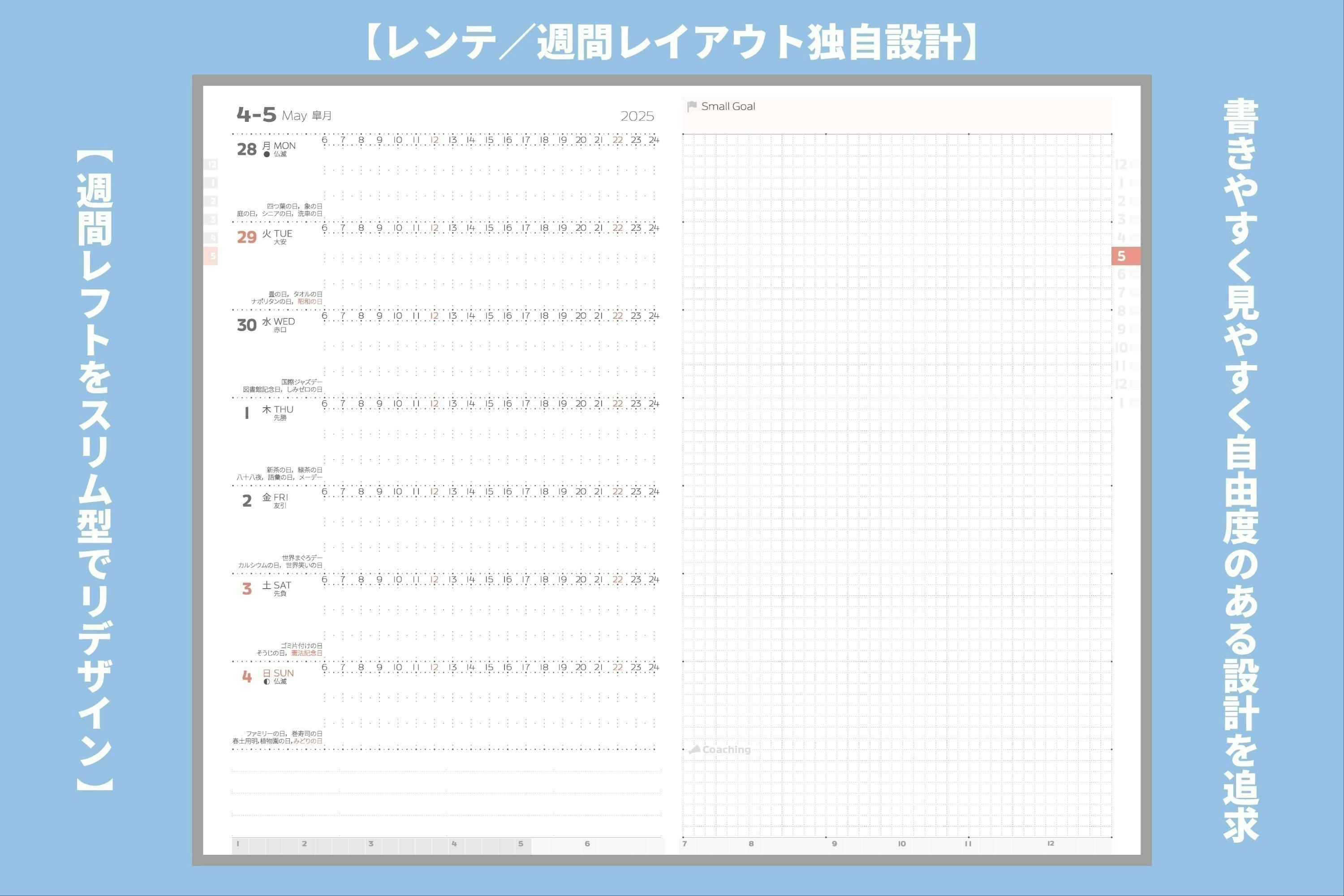 今回ご紹介の手帳(レンテ)は、そんな中で週間レフトの昔ながらの設計を見直してリデザインし、スマートかつ機能的に週間レフトをご活用いただける手帳として、試行錯誤のうえ開発されたものになります。