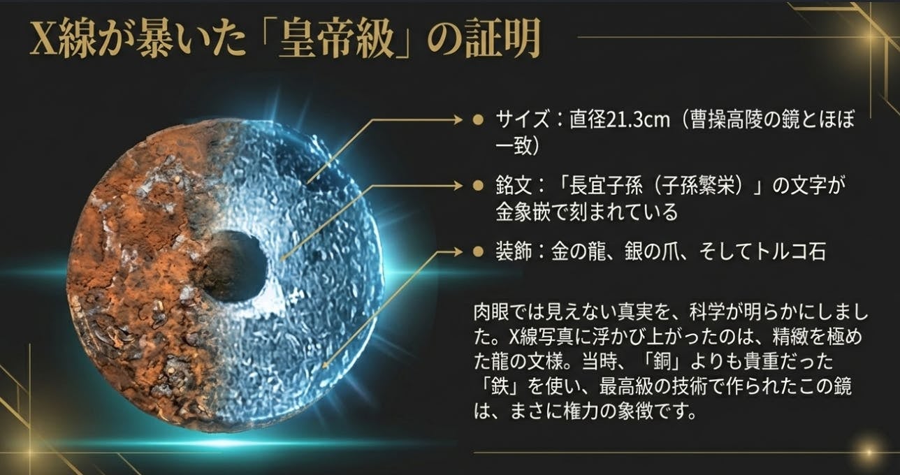 1933年、日田のダンワラ遺跡。土の中から現れたその無骨な鉄の塊に、大叔父はただならぬものを感じ取りました。分厚い錆の奥底で、かすかに、しかし確かに瞬く金と銀の輝き──それは、古代中国の最高峰の技術の結晶であり、皇帝への献上品にしか許されない至高の鏡でした。