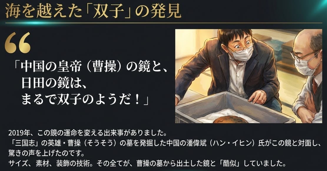 そしてこの鏡は、三国志の英雄・曹操の墓(曹操高陵)から発掘された鏡と同型であることが確認されています。2019年には曹操高陵の発掘責任者自身が、この日田の鏡を見て「卑弥呼の鏡である可能性が高い」と見解を示し、NHKをはじめ、全国メディアが大きく報じました。