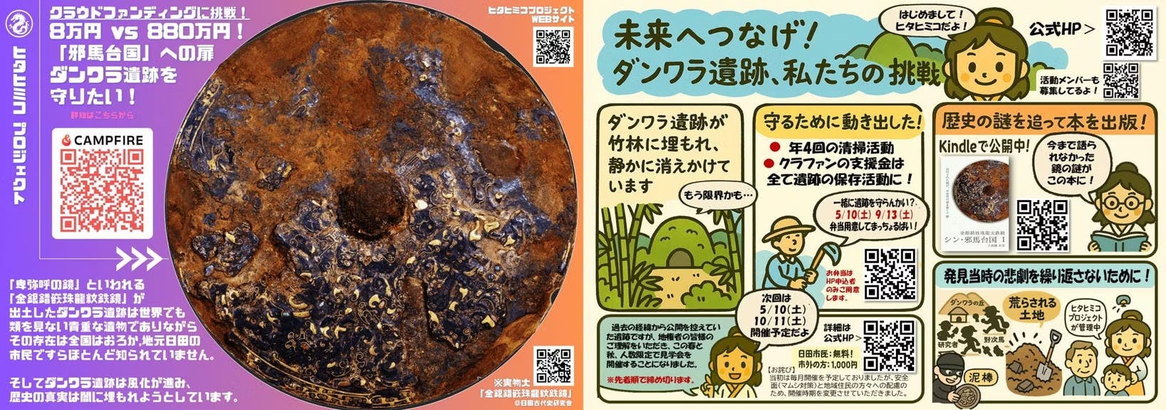 私たちの活動は、すでに地域を変え始めています。世界遺産・日田祇園山鉾の人形に「卑弥呼」が登場する前代未聞のコラボレーションが実現。日田市の観光冊子にも特集され、地元小学校の歴史学習にダンワラ遺跡が組み込まれるようになりました。