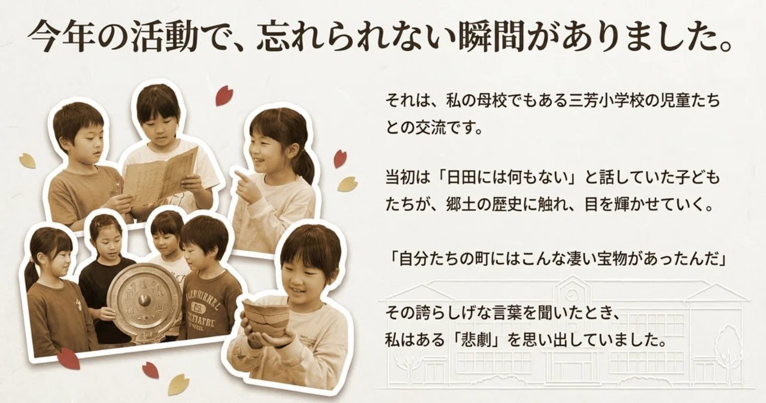 実物大の鉄鏡模型を手にした地元の小学6年生の女の子が言った一言──「日田って田舎だと思ってたけど、邪馬台国があったらすごい」。この言葉を聞いたとき、私たちは胸が震えました。子どもたちが自分の故郷を誇りに思い始めている。大叔父が夢見た未来が、確かに動き始めているのです。