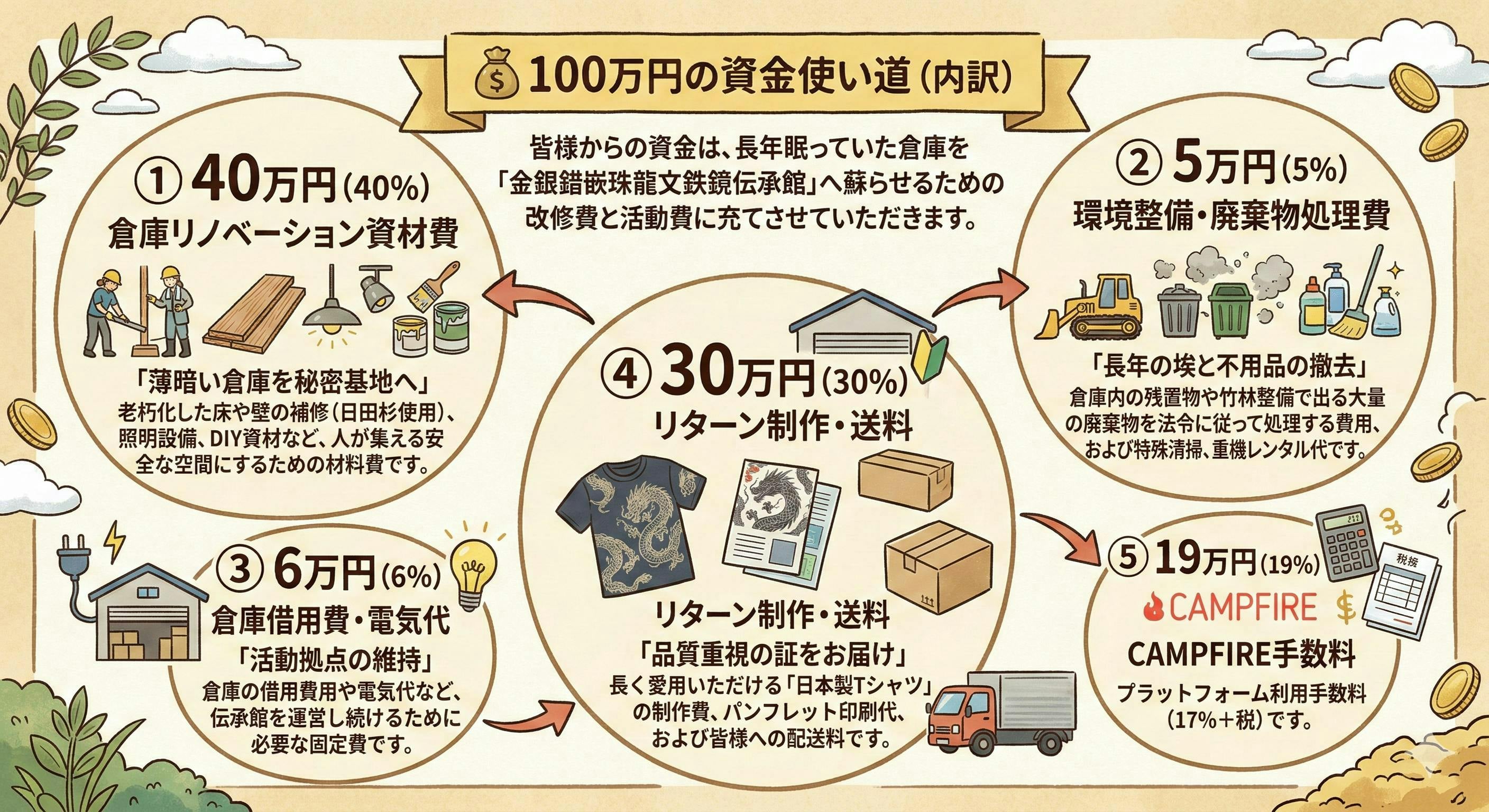 正直にお伝えします。今回の目標金額100万円だけでは、伝承館は完成しません。手数料やリターン費用を差し引くと、実際に改修に使える資金は50〜60万円ほどです。