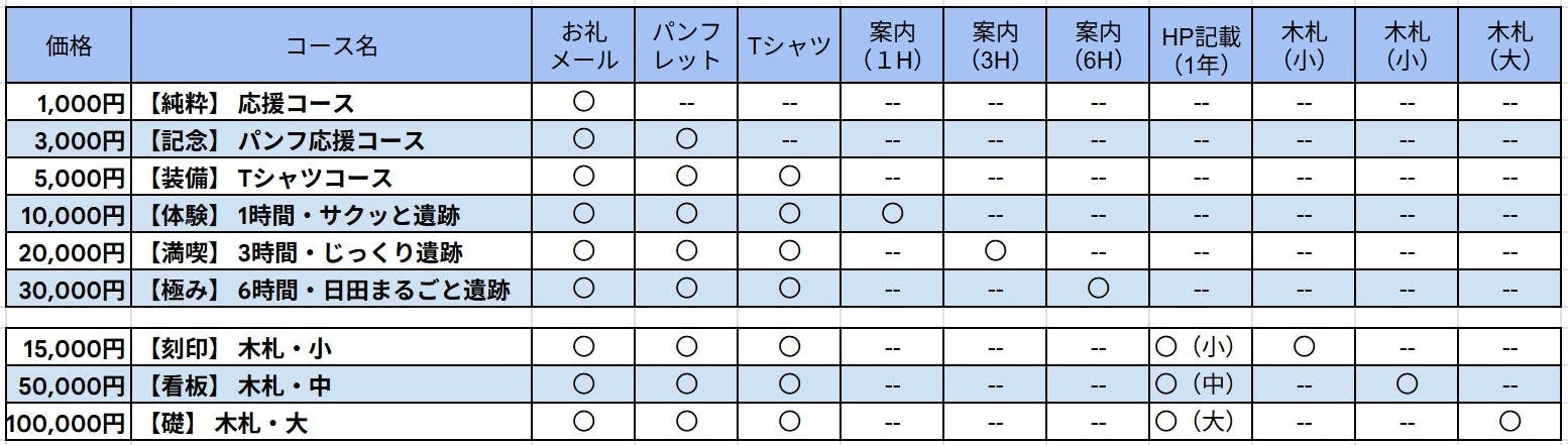 • 30,000円:【極み】6時間・日田まるごと遺跡 ダンワラ遺跡に加え、日田市内の他の遺跡や伝承の地を巡るオーダーメイドのミステリーツアー。Tシャツ・冊子付。