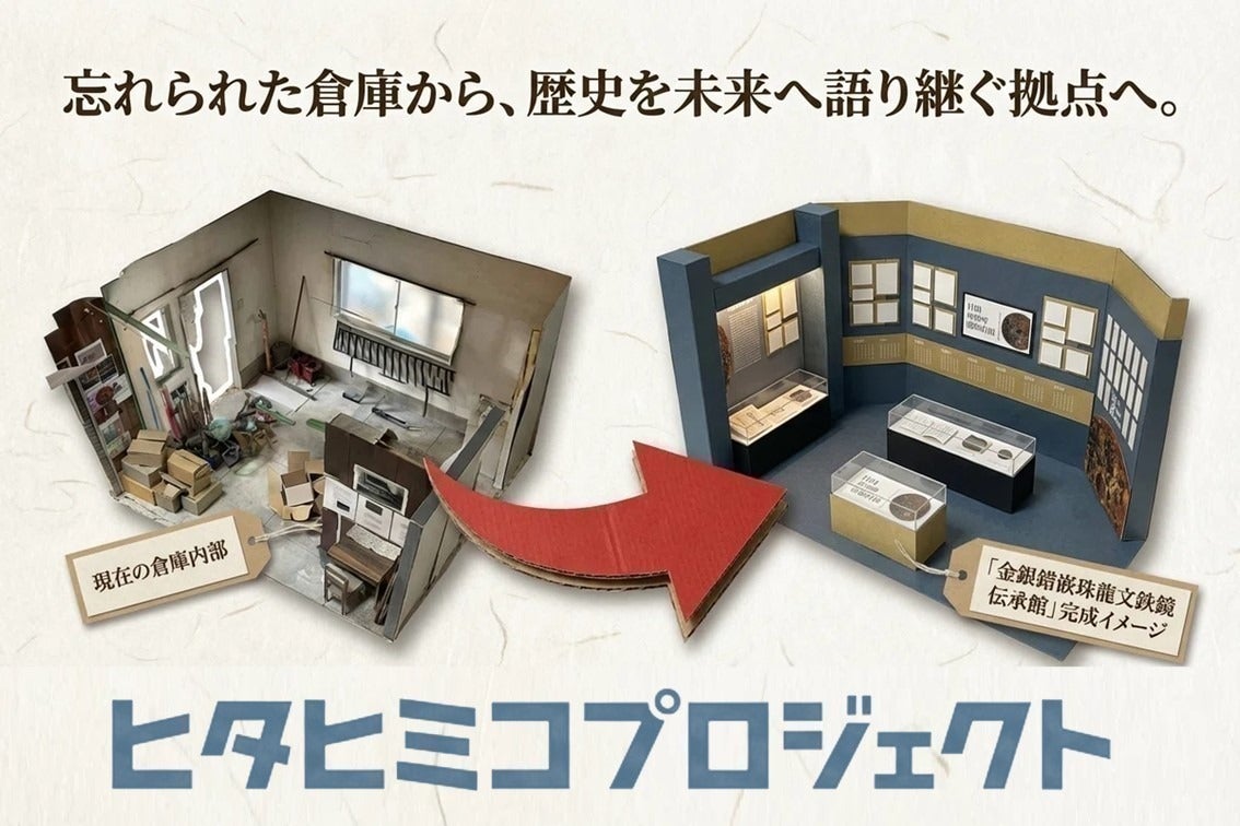だからこそ私たちは、新たな挑戦を決意しました。JR豊後三芳駅の片隅に残る古い倉庫。このボロボロの建物を、この地から後世へと語り継ぐための特別な場所「金銀錯嵌珠龍文鉄鏡 伝承館」──歴史の謎を解く「秘密基地」に変えます。