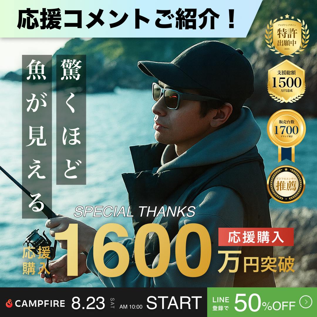 平素よりご支援いただき、誠にありがとうございます。現在実施中の偏光サングラス「Gillsee(ギルシー)」クラウドファンディングにつきまして、多くの皆さまからご支援をいただき、応援購入総額は2,300万円を突破いたしました。これまでに1,900名を超える方々にご支援いただき、ビックカメラでの展示や各種メディアでのご紹介など、多方面で注目を集めております。なお、本プロジェクトは 10月31日(木)23時59分 をもって終了となります。この機会を逃すとご購入いただけませんので、ぜひお早めにご検討ください。─────────────────「Gillsee」クラウドファンディングページhttps://camp-fire.jp/projects/875027/view─────────────────引き続きのご支援・ご声援のほど、何卒よろしくお願い申し上げます。