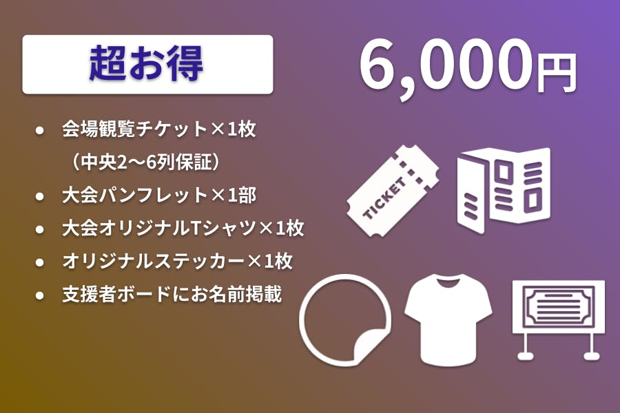 会場観覧チケット(中央ブロック2〜6列保証)をご提供します。先行枠として合計41席限定での販売となり、ステージを間近で楽しめる特別な席をご用意します。大会パンフレットも当日お渡しします。