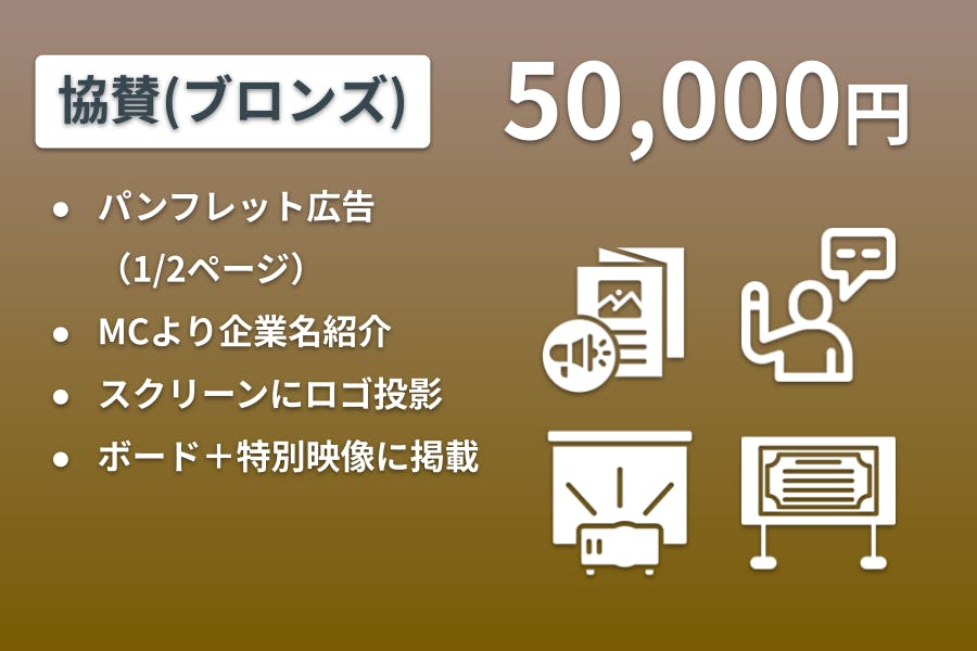 大会を協賛企業としてご支援いただけるブロンズクラスのコースです。大会パンフレットに広告(1/2ページ)を掲載し、会場スクリーンにロゴを投影します。大会本番ではMCより企業名をご紹介し、支援者掲示ボードと特別映像にも企業名を掲載します。