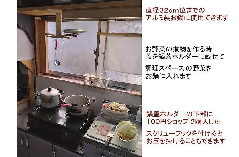 取り付ける場所は、台所の前面で邪魔にならない「空間」を利用することを考えました。(上向きに置きますのでフタに付いている水滴は落ちません)後ろを振り向く必要がなくなり前を向いたままで、手を伸ばせば届くので調理時間の短縮にもなります。