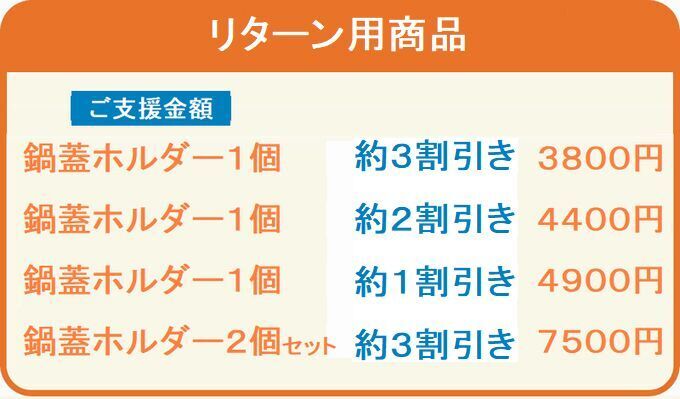 リターンは商品の鍋蓋ホルダーでお返しします。段ボール箱で発送しますので、全国で送料に違いがありますが支援金額は統一にして送料込み、税込みで定価5500円で設定させて頂き、割引き価格にてご提供させていただきます。