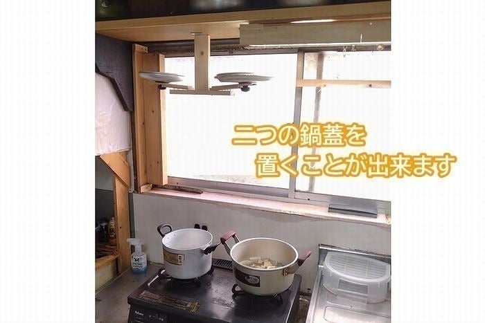 取り付ける場所は、台所の前面で邪魔にならない「空間」を利用することを考えました。(上向きに置きますのでフタに付いている水滴は落ちません)後ろを振り向く必要がなくなり前を向いたままで、手を伸ばせば届くので調理時間の短縮にもなります。
