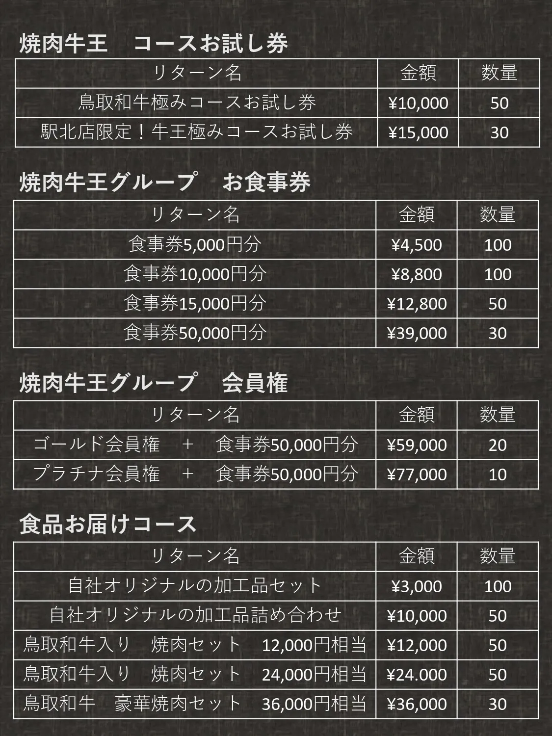 新店舗『焼肉牛王 鳥取北口店』のオープンを記念した今回のクラウドファンディングでは、焼肉牛王こだわりのコースを実質半額でお試しいただけるリターンや、最大で22%OFFのお得な食事券などをご用意しました!