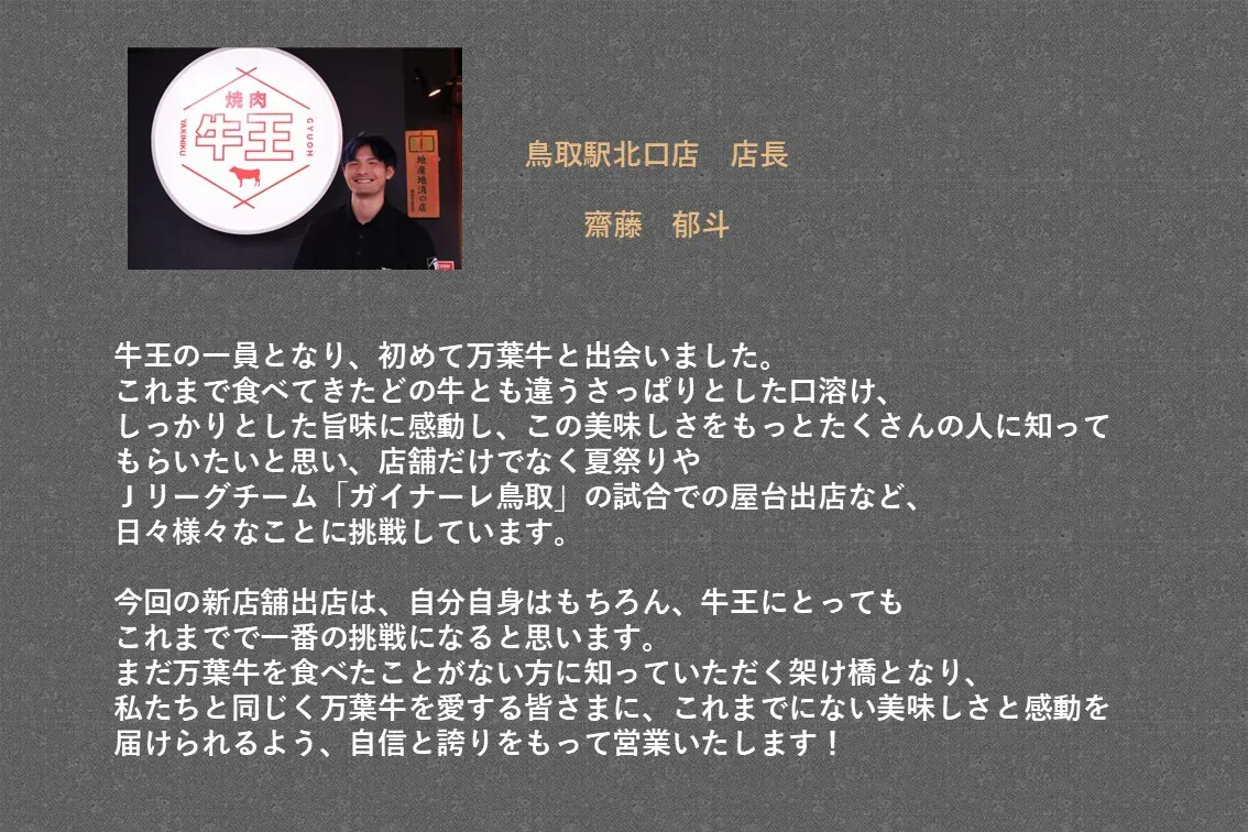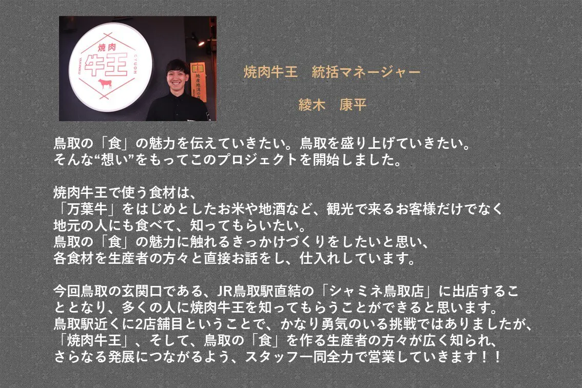 2020年に1号店となる「焼肉牛王 鳥取本店」を、2022年に2号店の「焼肉牛王 倉吉店」をオープンしました。