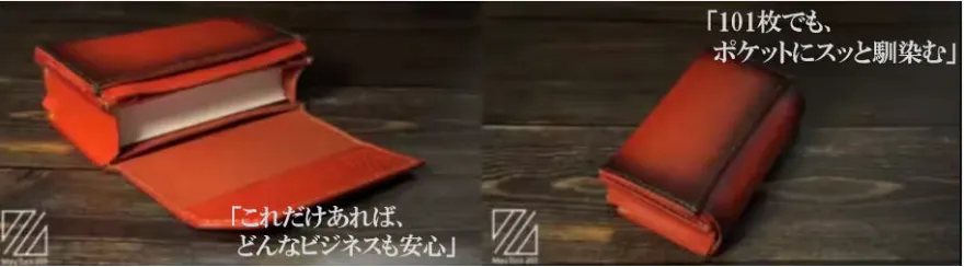 「可変性」、名刺が少ない時はコンパクトに、多い時にも安心して、これ一つで持ち歩くことで、スマートなビジネスマンを印象付けます。