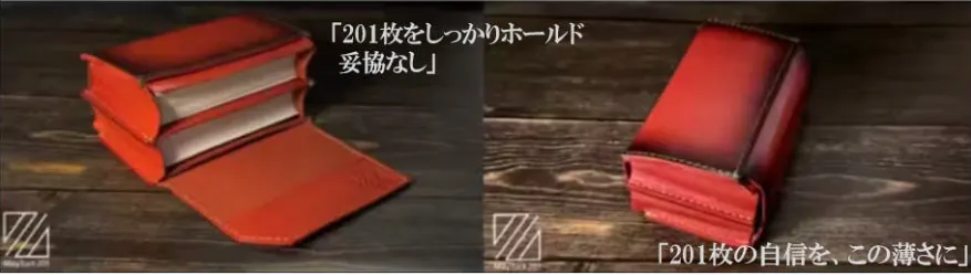 (多くの場合は、例えば50枚入る名刺入れだと、数枚しか入れていない場合にはスカスカになってしまいます。しかし、本商品は最大201枚入る名刺入れですが、例え1枚しか収納しない場合でもしっかりと収納することができる「大きさが変わる名刺入れ」です。)