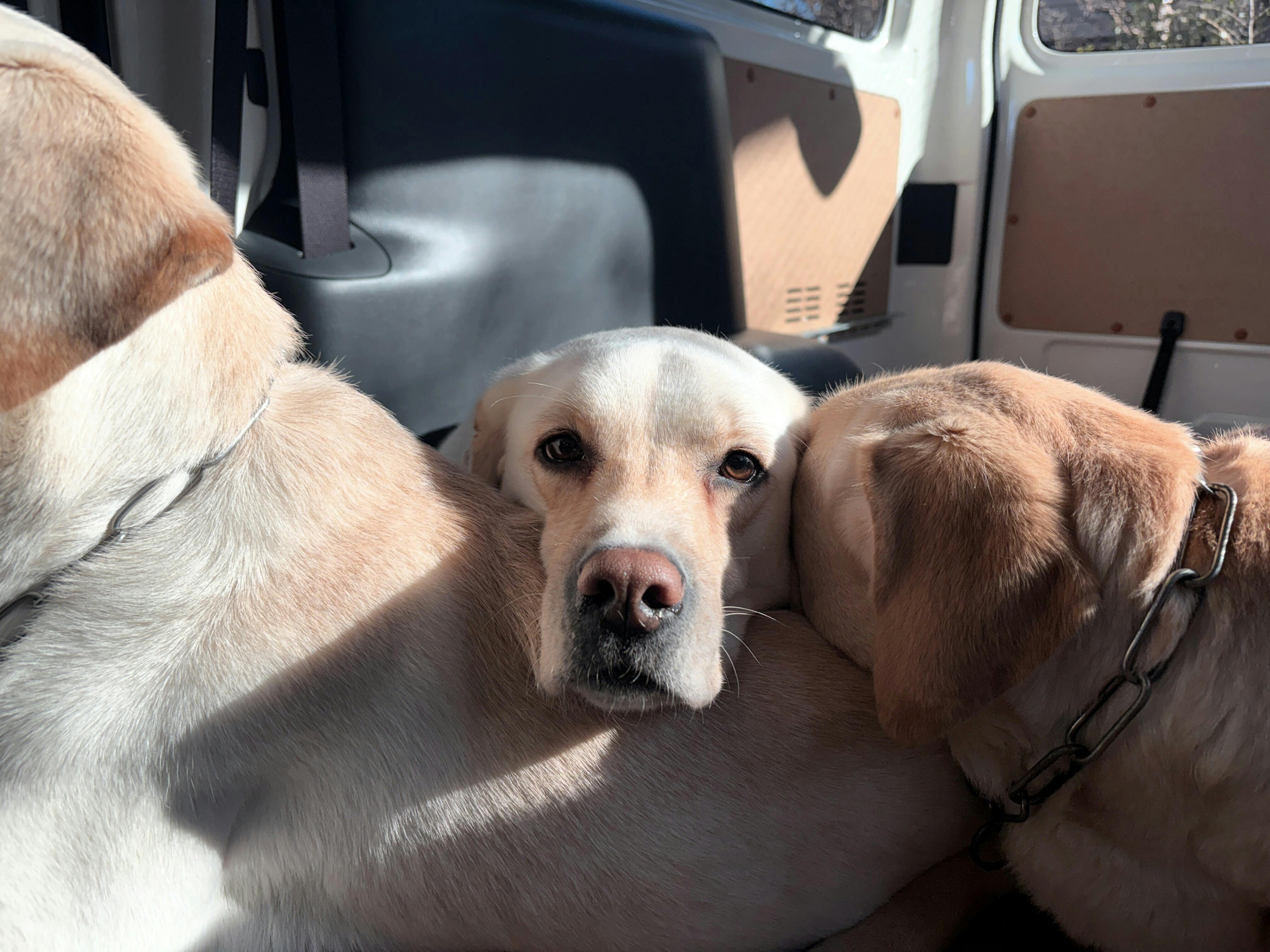 新しい車内で、アイメイト候補犬もリラックスした様子で過ごしています。