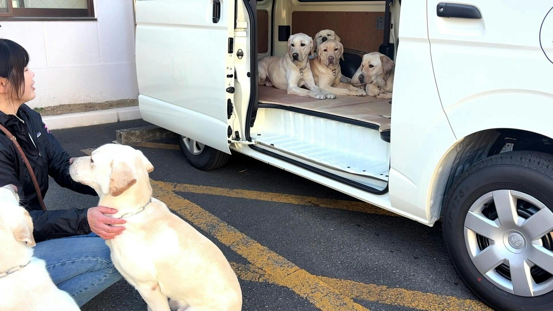 犬たちが張り切った様子で新しい車に軽快に乗り込んでいます。
