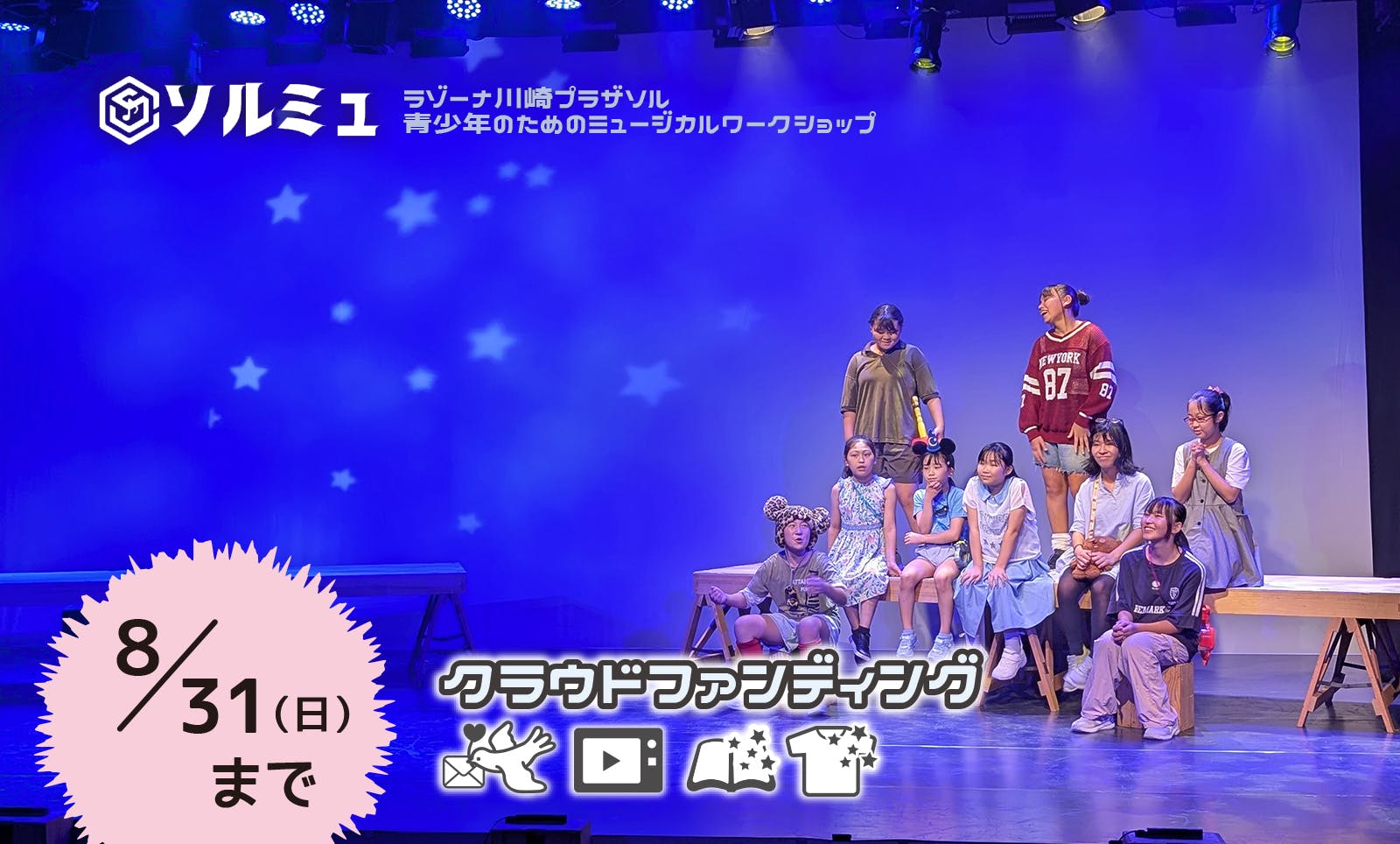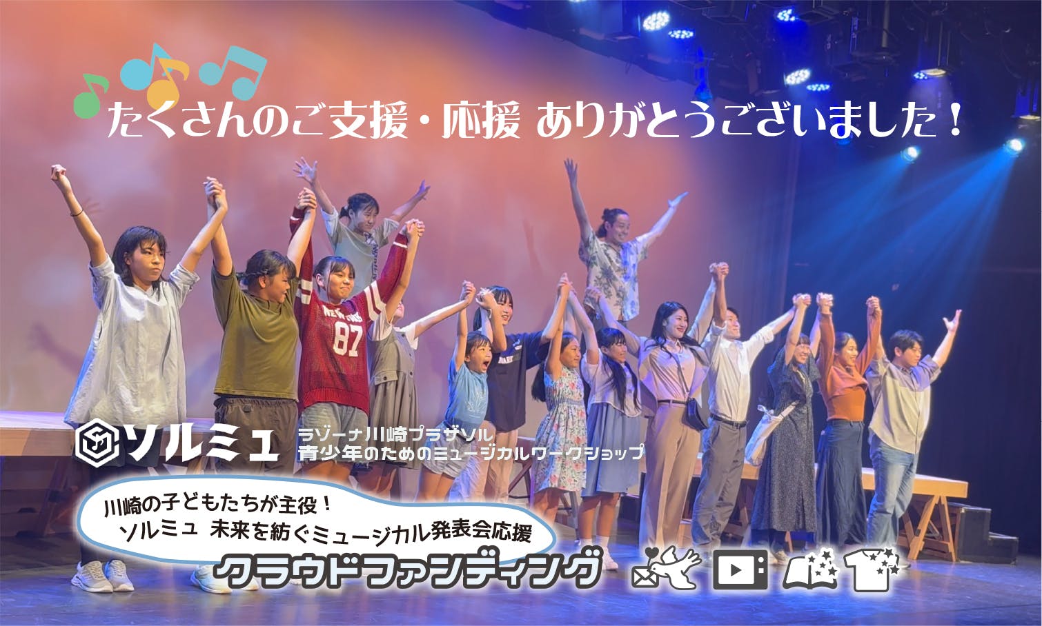 • 先日8月31日をもちまして、お蔭さまで無事にプロジェクト期間を終えることができました。たくさんのご支援・応援をいただきまして、心より御礼申し上げます。♪:。・゜♪:。・゜♪:。・゜♪:。・゜♪:。・゜今回、このプロジェクトを立ち上げ、皆様にご支援を募ったことで、私たちが「すべての子ども達に舞台の魔法を」と願うこの企画が、多くの方にとってご賛同いただけることを実感し、大変嬉しく思っております。夏の数日間、年齢や背景の異なる子ども達が集い、ミュージカルの発表を目標に一丸となって取り組む。あっという間に成長していく子ども達の姿を見守りながら、このかけがえのない機会をもっと多くの子どもたちに体験してほしく、この企画の発展へ責任を改めて感じています。今回のクラウドファンディングを通していただいたご支援、応援に背中を押していただき、これからもますますの発展をさせていくことに、決意を新たにしております。♪:。・゜♪:。・゜♪:。・゜♪:。・゜♪:。・゜今後はリターンの準備を進めてまいりますので、引き続き応援のほど、どうぞよろしくお願いいたします。そして、「ソルミュ」は来年もまた、ラゾーナ川崎プラザソルで実施する予定でおります。またの機会にはぜひともご支援・応援を賜りたく、今後ともどうぞよろしくお願いいたします。 もっと見る