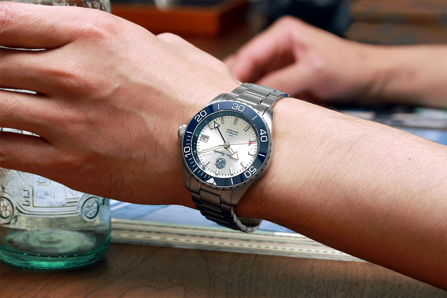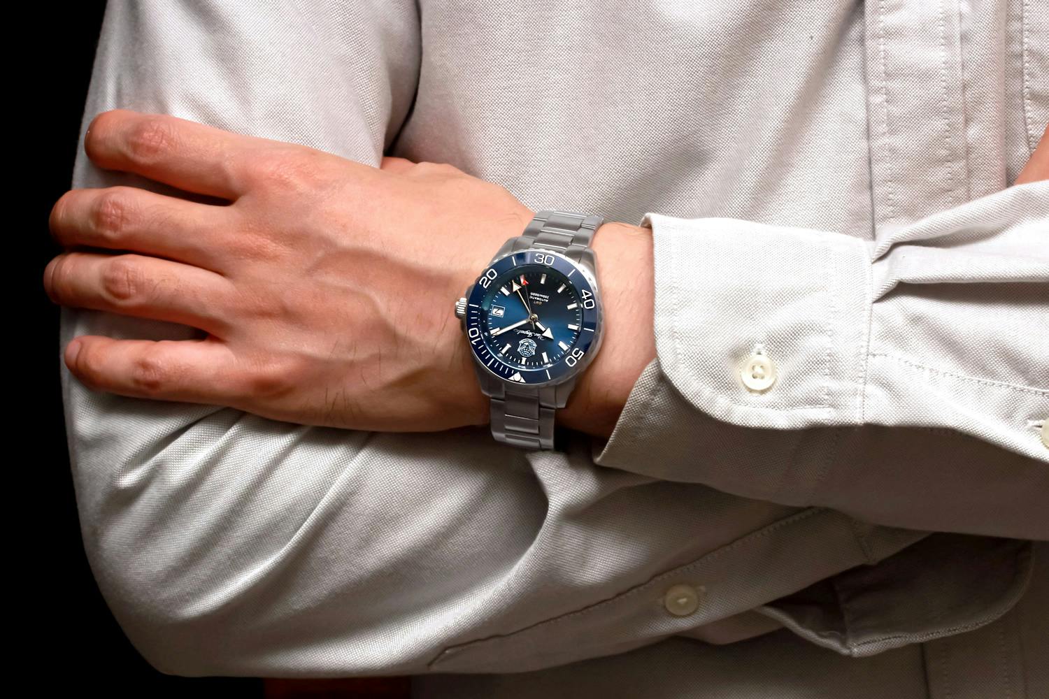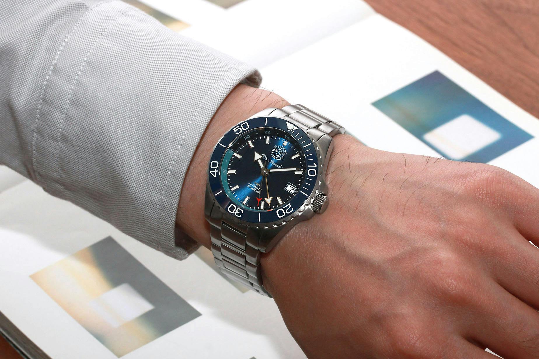 「ブルーインパルス GMTダイバーズ」は、“ブルーインパルス”の精神と美意識を、1本の時計に凝縮したデザインが最大の魅力です。ブルーインパルスのような正確さとタフネスを象徴するデザインに仕上げた、伝統的スタイルのダイバーズウォッチ。
