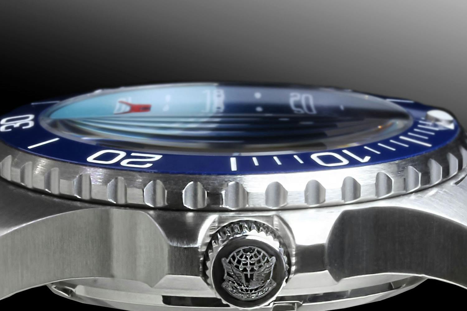 風防には、傷に強く透明度の高いサファイアガラスを採用。内側に無反射コーティングを施し、視認性を向上させています。さらに、わずかにカーブしたエッジ加工により、立体感と高級感を演出しています。