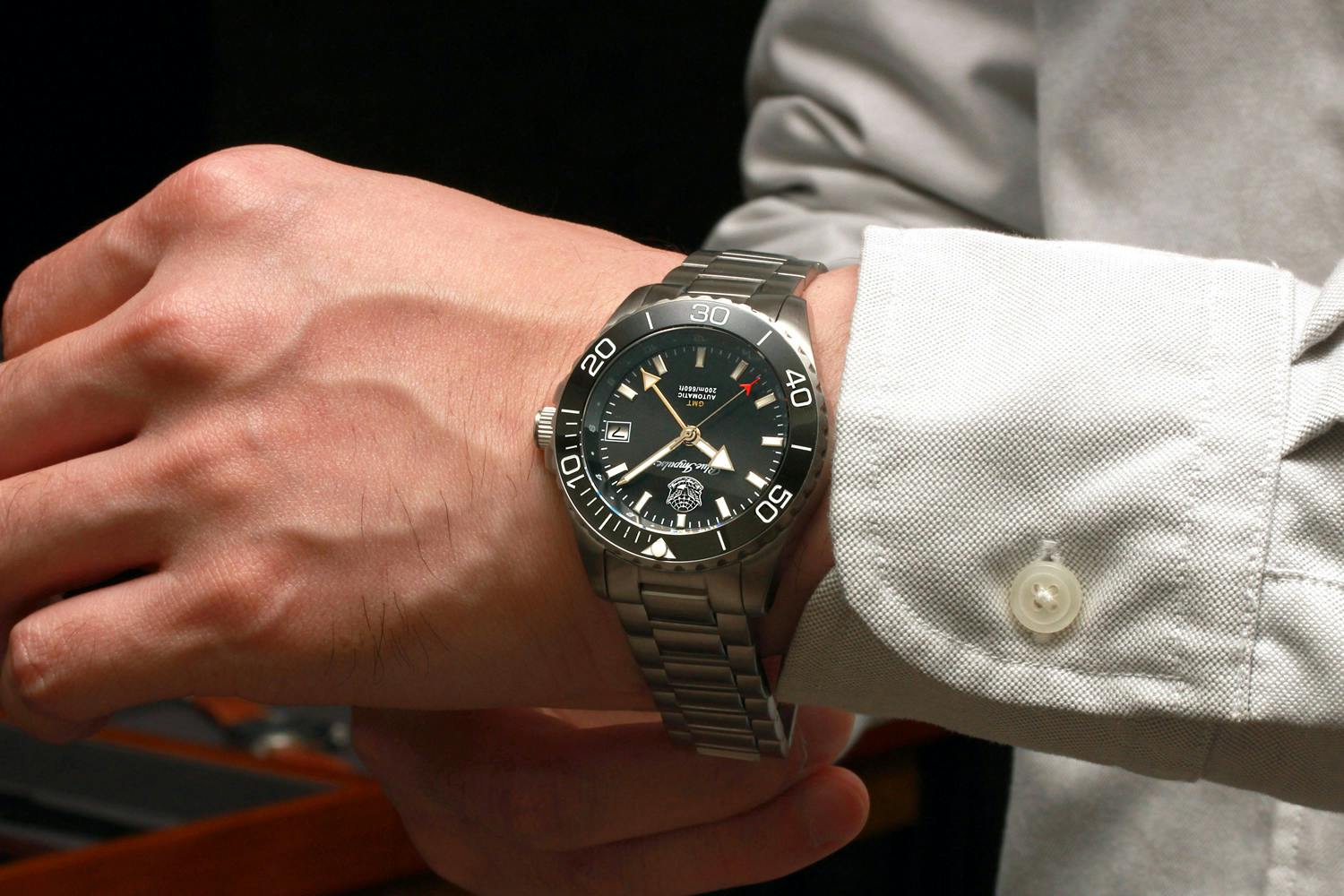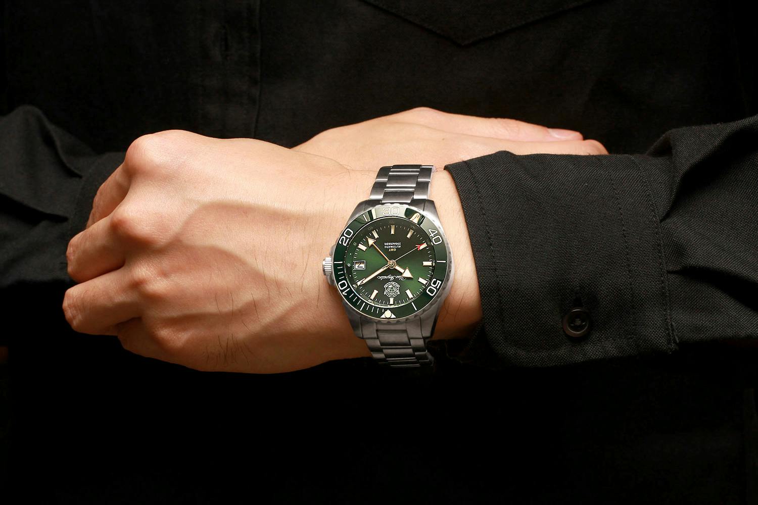 200M(660フィート)の防水性能を備え、20気圧防水(200m相当)の本格仕様。日常生活~スイミング、浅いシュノーケリングに対応。逆回転防止ベゼルやねじ込み式リューズを搭載し、実用性と信頼性を兼ね備えたフルスペックモデルです。ムーブメントは高品質な日本製を採用し、防水検査もクリア。日常からマリンアクティビティまで対応する、信頼の1本です。