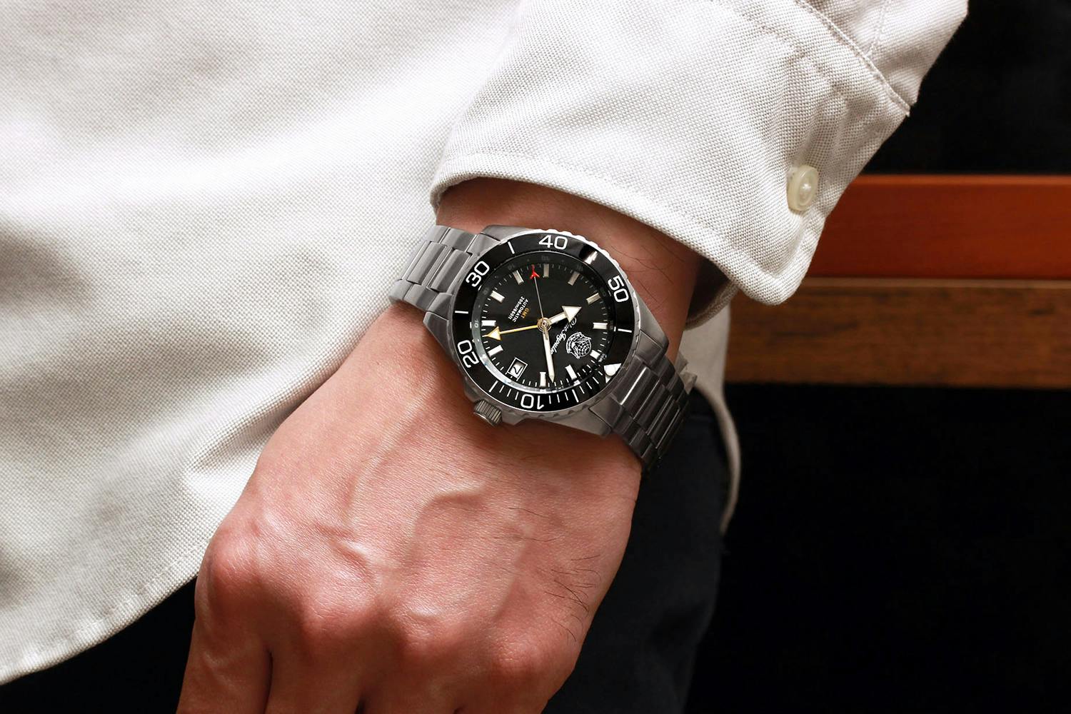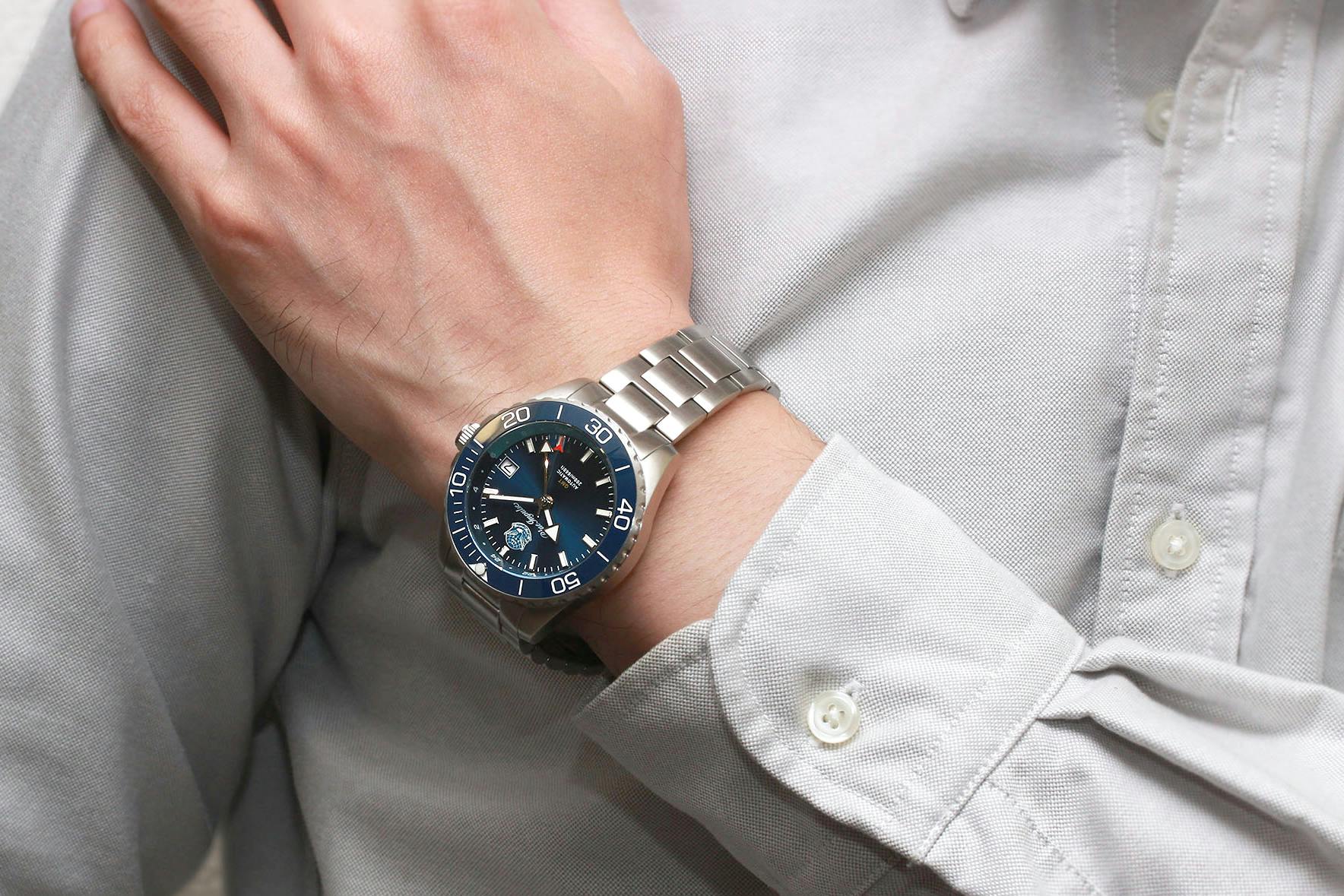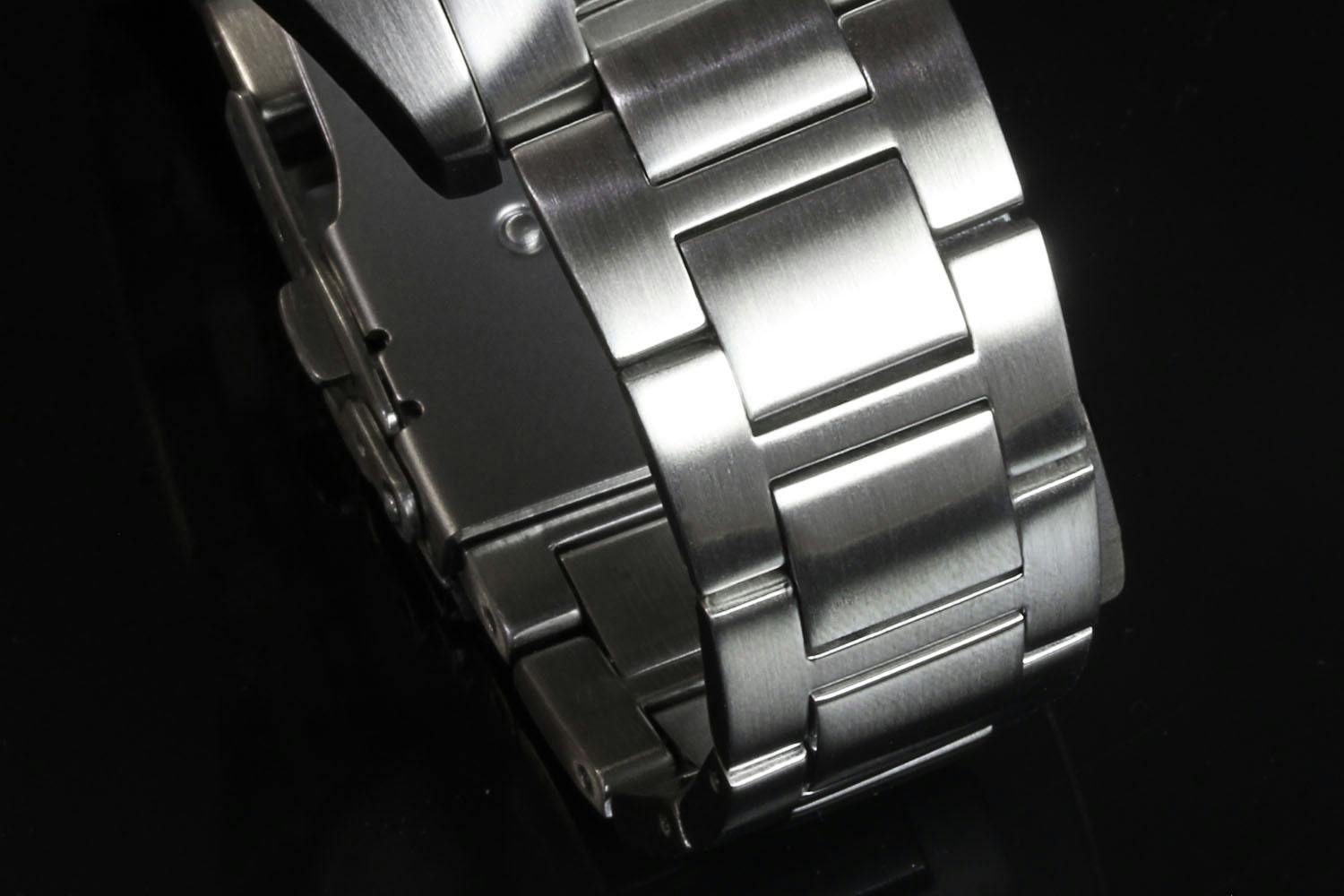 オールステンレスの錆や傷に耐性のあるヘアライン仕上げブレスレットを採用。鏡面とは異なるマットな光の反射が特徴で、派手すぎず、落ち着きのある上品な印象を演出します。ダイバーズウォッチとの相性も抜群で、信頼感のあるプロフェッショナルな雰囲気に仕上がります。