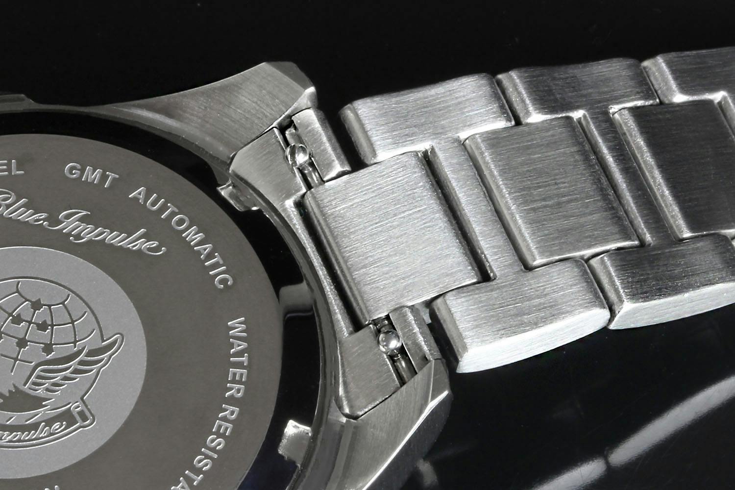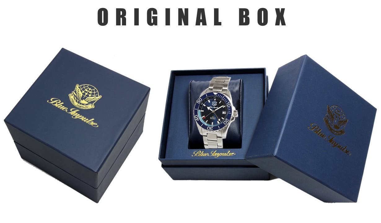 青と白、そして日の丸の赤がカラーリングされた美しいブルーインパルスの機体をイメージしたデザイン。空を駆けるアクティブなイメージにぴったりなダイバーズウォッチ。そして世界中の空を自由自在に飛行する姿から、GMTを採用。ブルーインパルスの魅力が余すところなく凝縮された腕時計となっております。