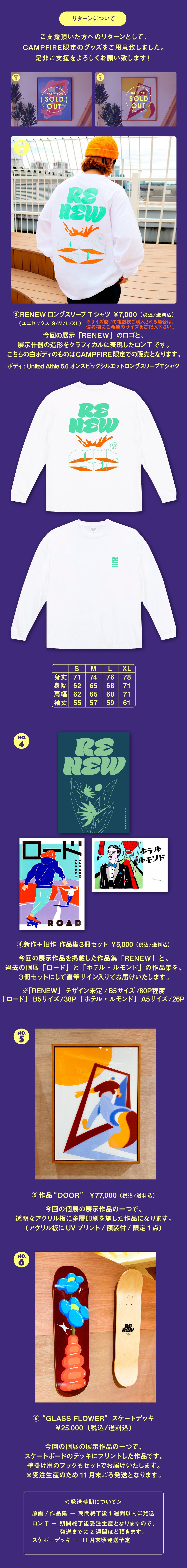 RENEWロングスリーブTシャツ (ユニセックス S/M/L/XL ) 今回の展示「RENEW」のロゴと、 展示什器の造形をグラフィカルに表現したロンTです。 こちらの白ボディのものはCAMPFIRE限定での販売となります。 ボディ: United Athle 5.6オンスビッグシルエットロングスリーブTシャツ