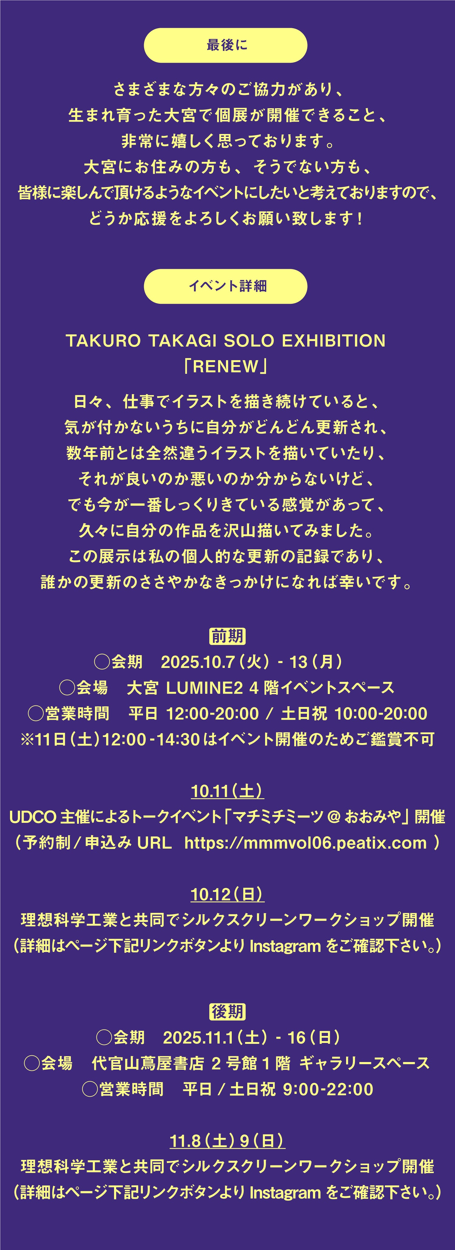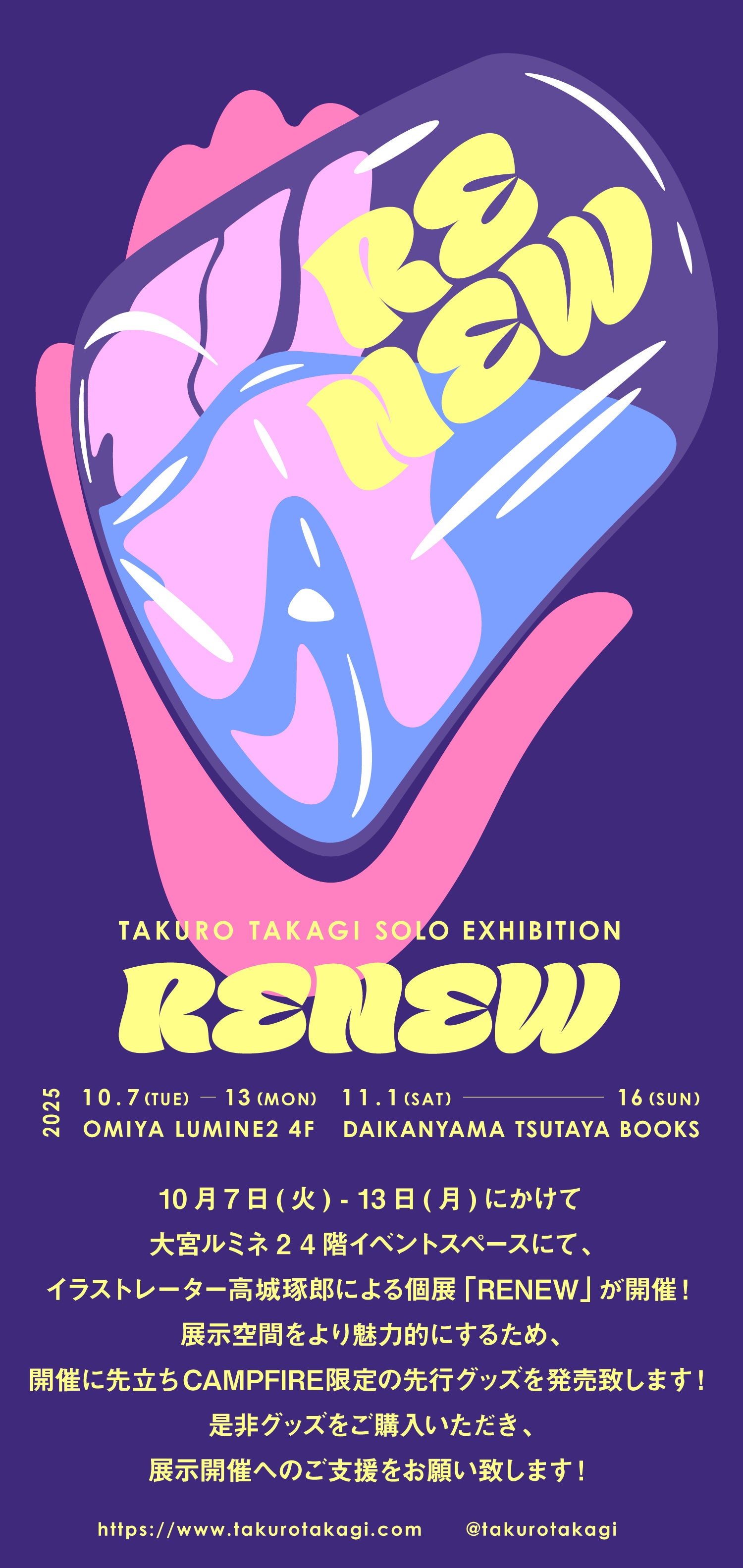新作 + 旧作 作品集3冊セット 今回の展示作品を掲載した作品集「RENEW」と、 過去の個展「ロード」と「ホテル・ルモンド」の作品集を、 3冊セットにして直筆サイン入りでお届けいたします。 ※「RENEW」 デザイン未定/B5サイズ/50P程度 「ロード」 B5サイズ/38P 「ホテル・ルモンド」 A5サイズ/26P
