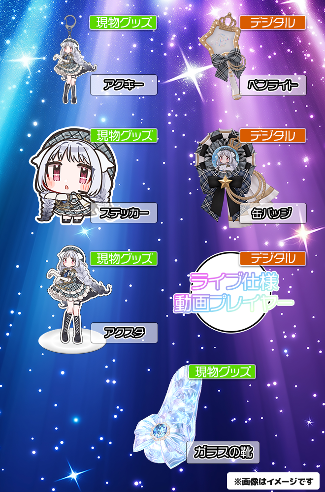 デジタルは3Dモデルやデジタルデータなどを指し、現物グッズはアクリルキーホルダーなどのお手元に郵送でお届けするオリジナルグッズとなります。