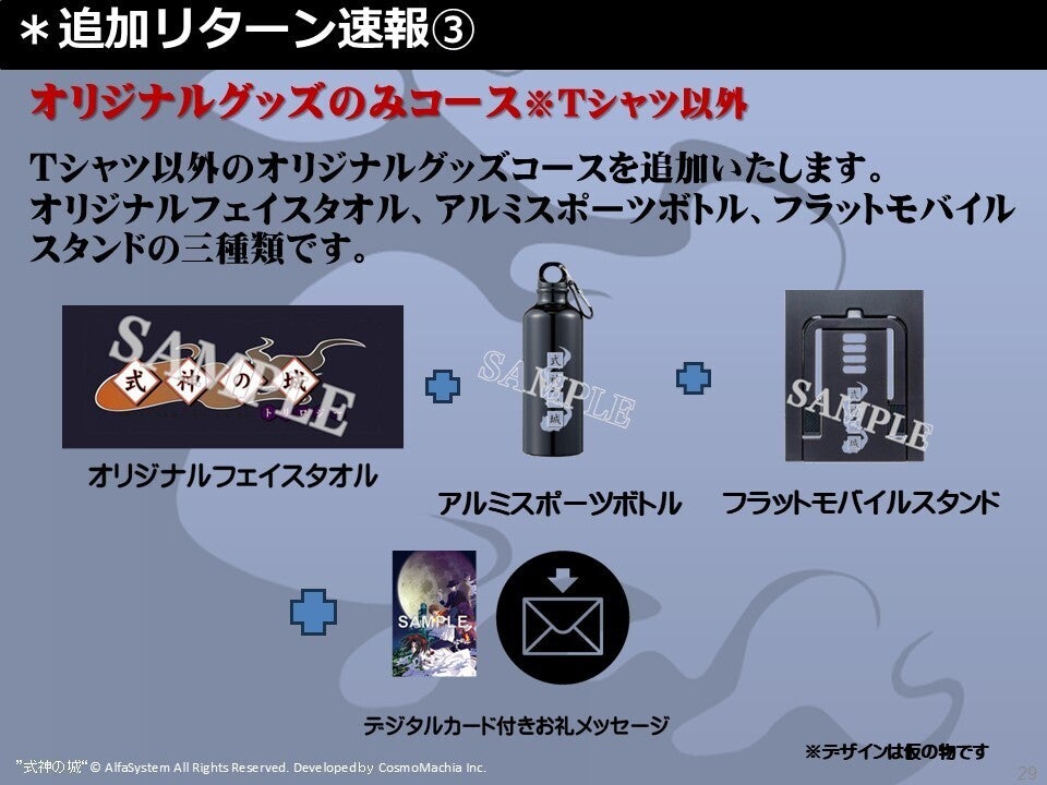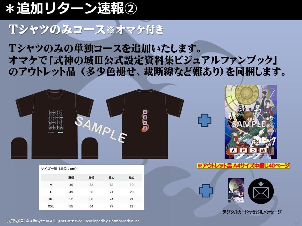オリジナルグッズコースでTシャツのみをご希望の方も多かったので、こちらのコースを追加しました。梱包の隙間でオマケとして前回のリターン品の「式神の城Ⅲ公式設定資料集ビジュアルファンブック」のアウトレット品 (多少色褪せ、裁断線など難あり)を同梱します。一応普段読みで問題ないと思われる歩留まり品ですが限定数が10ですので交換等には応じられませんのでご了承ください。