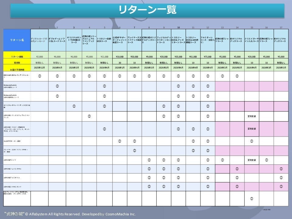 プロジェクトページに貼ってある表が小さいというご指摘もありまして、またリターンも追加したので更新しました。