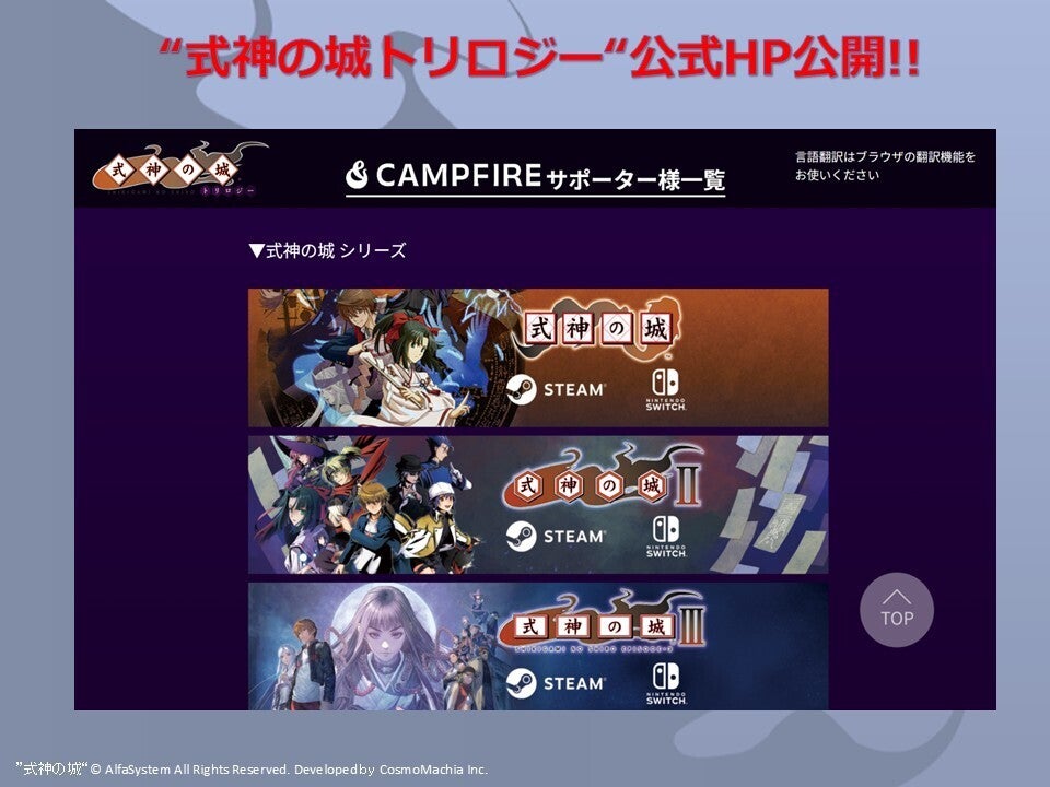この度は、”名作「式神の城」シリーズをNintendo Switchに全移植したい!”プロジェクトにご支援いただきありがとうございました。