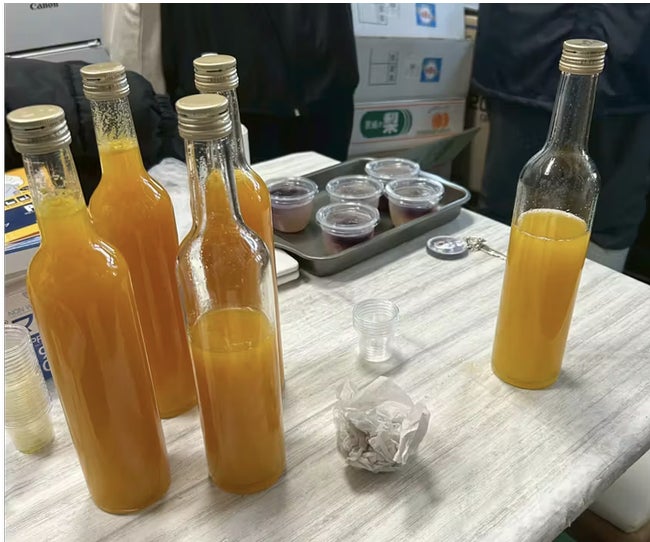 今回の試作会では、2種類のほおずきジュースを試作・試飲しました。一つ目は、180ml用のジュース。こちらのジュースは、50%ほおずきと50%梨果汁のブレンドジュースになります。味わいとしては、スッキリとした味わいながらも、ほおずき本来の甘酸っぱい味も楽しむことができました!二つ目は、500ml用ジュース。こちらはほおずき100%の濃厚なジュースになります。ほおずきをとても濃厚に感じられる逸品であったと共に、炭酸水と割って飲むことにも適したジュースとなっていました。