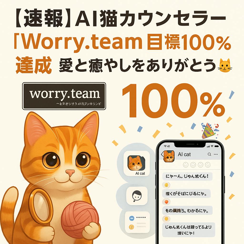 【速報】AI猫カウンセラー「Worry.team」目標100%達成!愛と癒やしをありがとう🐱