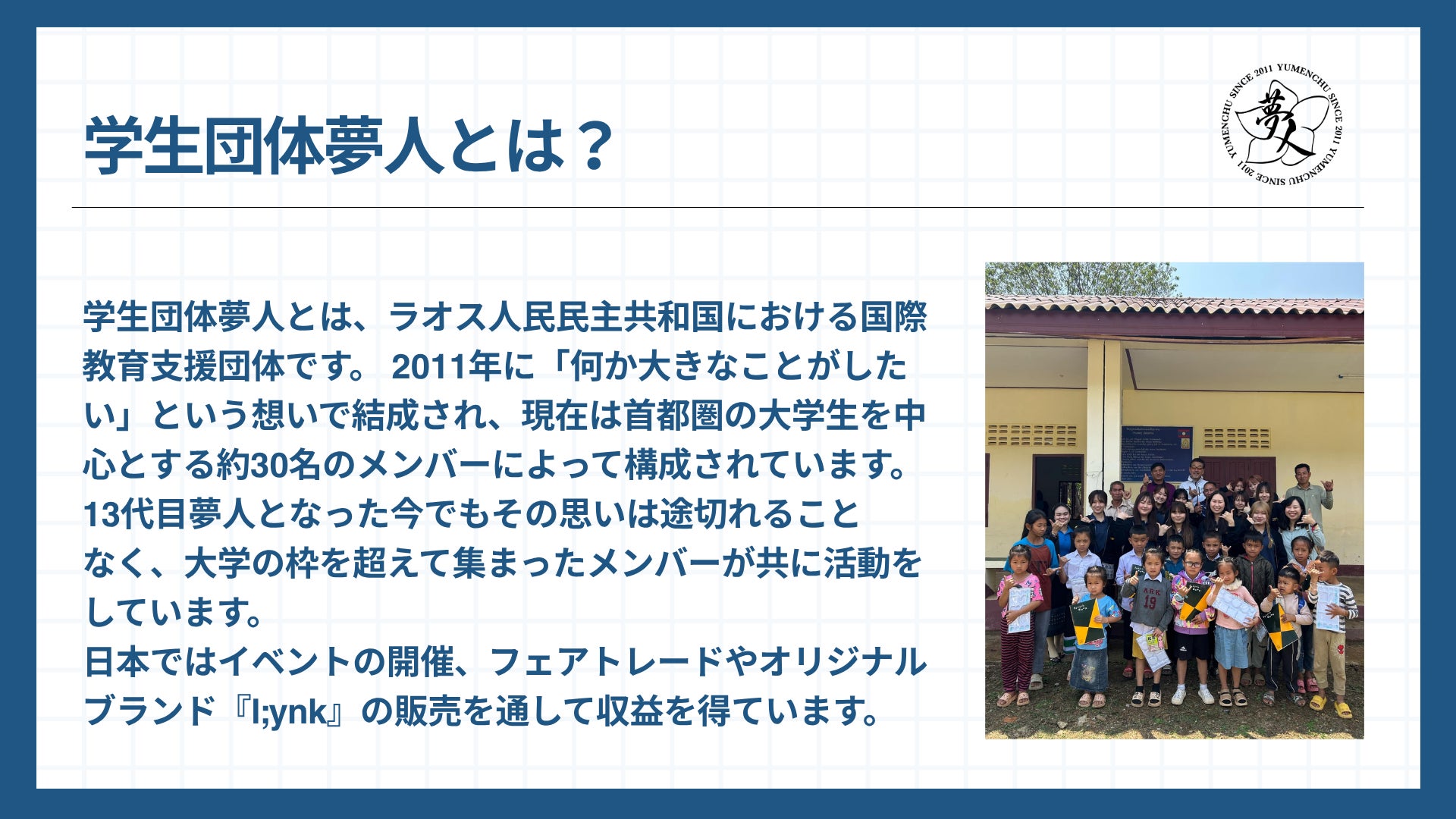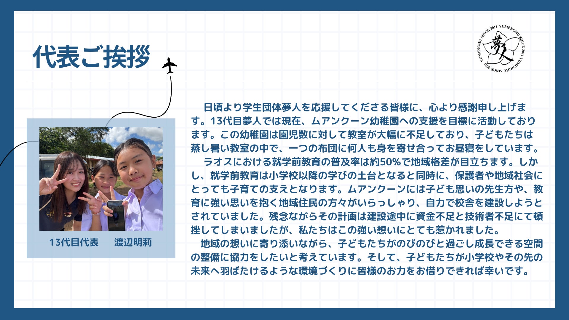 夢人はこれまで、多くのOBOGの皆さまをはじめ、大人の方々や企業様に支えられながら活動を続けてまいりました。この度、その中でも創設当初より顧問として寄り添い、毎年スタディーツアーにもご同行くださっている西山さん。そして、2023年度から通訳として5度にわたりツアーに同行し、夢人とラオスの架け橋となってくださっているスーさんより、温かい応援メッセージを頂戴しました。