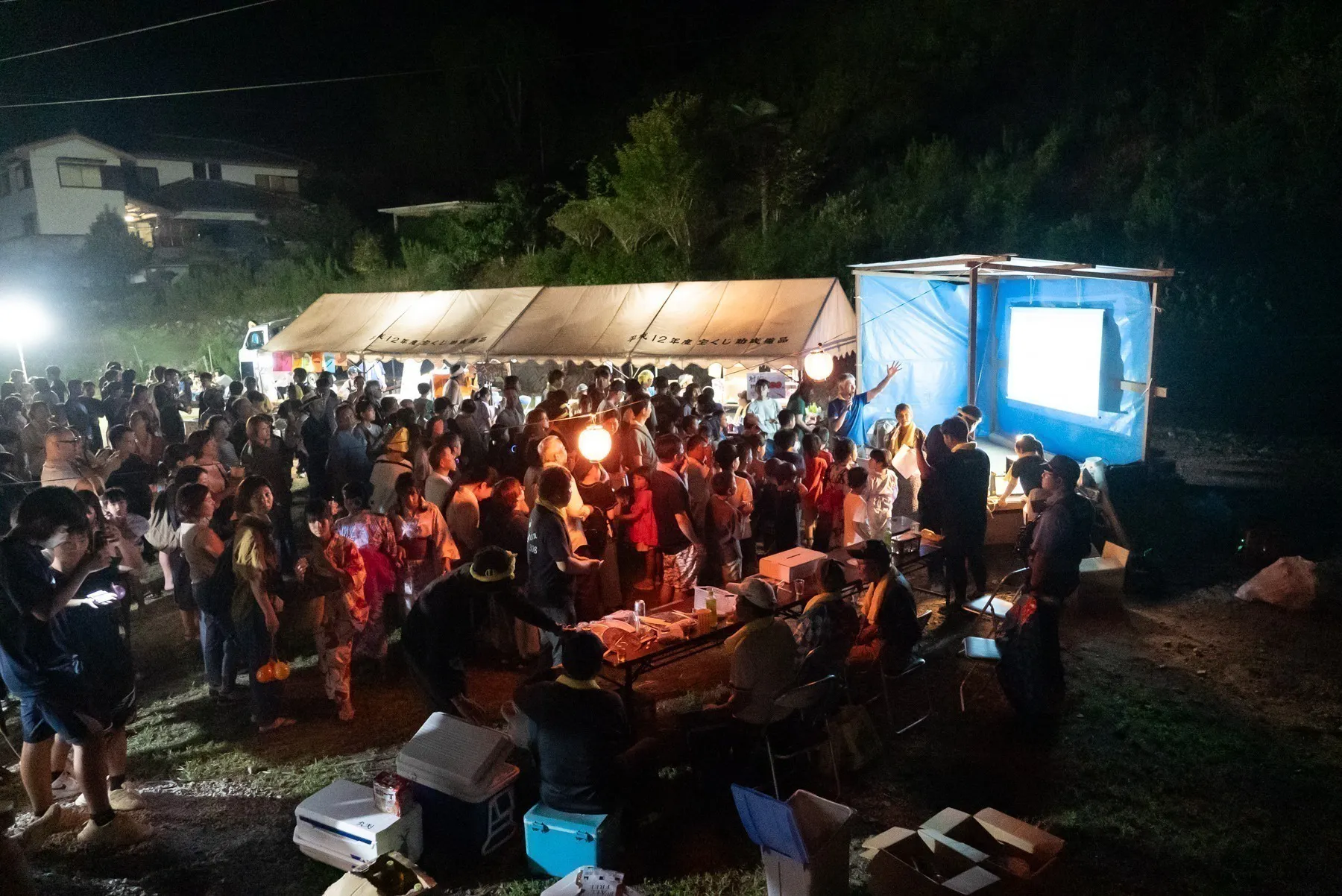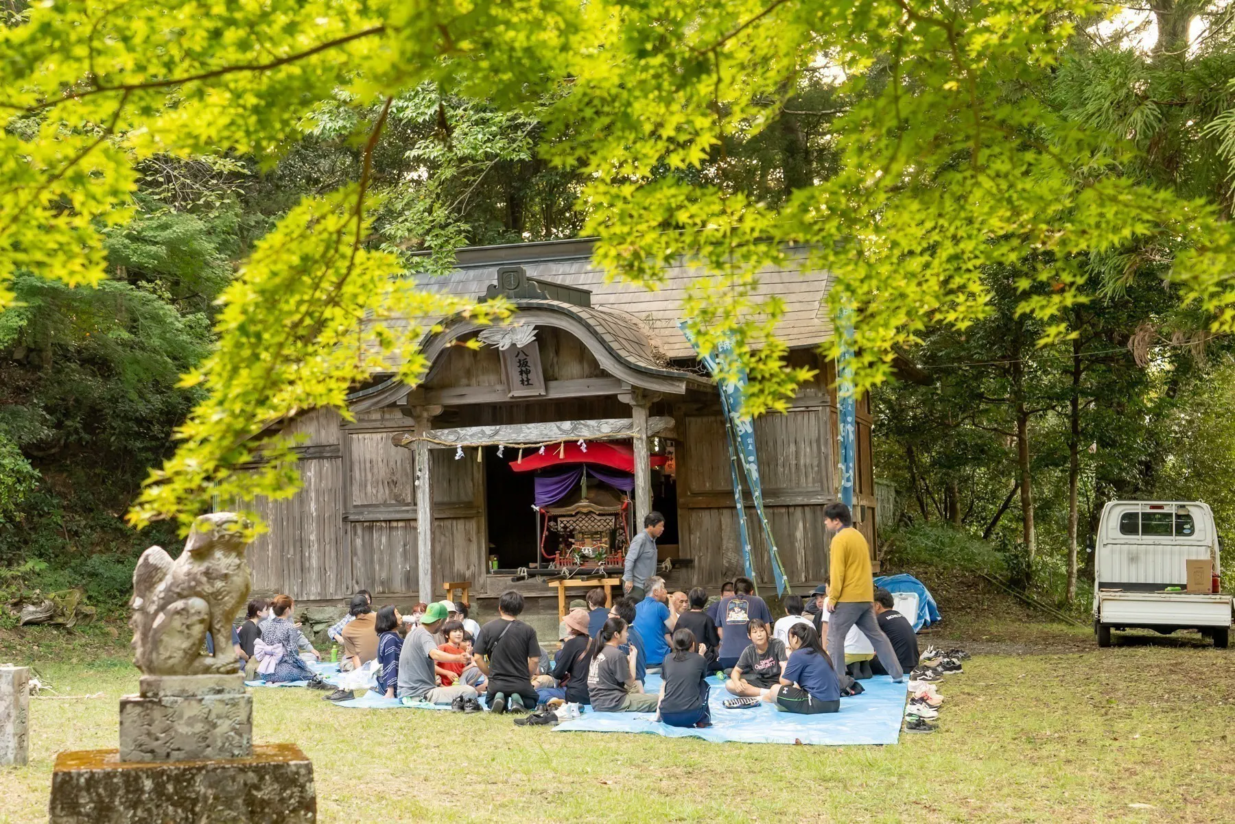 山あいの神社近くに集い、木々の隙間から夜空を見上げると、近距離で迫力のある花火が目の前に広がる——この地ならではの特別な体験は、地域の人々にとってかけがえのない夏の風物詩となっています。