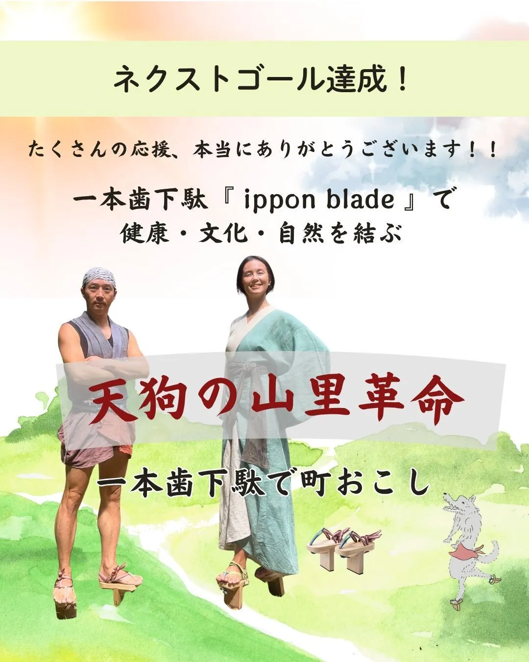 「天狗伝説の春野町で山里革命!一本歯下駄で町おこしへの挑戦」クラウドファンディング。