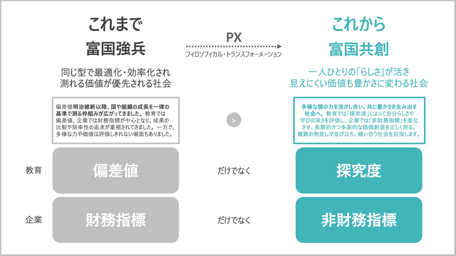 教育と企業、社会をつなぎ直し、一人ひとりの「らしさ」が活かされ、見えにくい価値も評価され豊かさになる〈富国共創〉へと「社会の変革」を目指します!