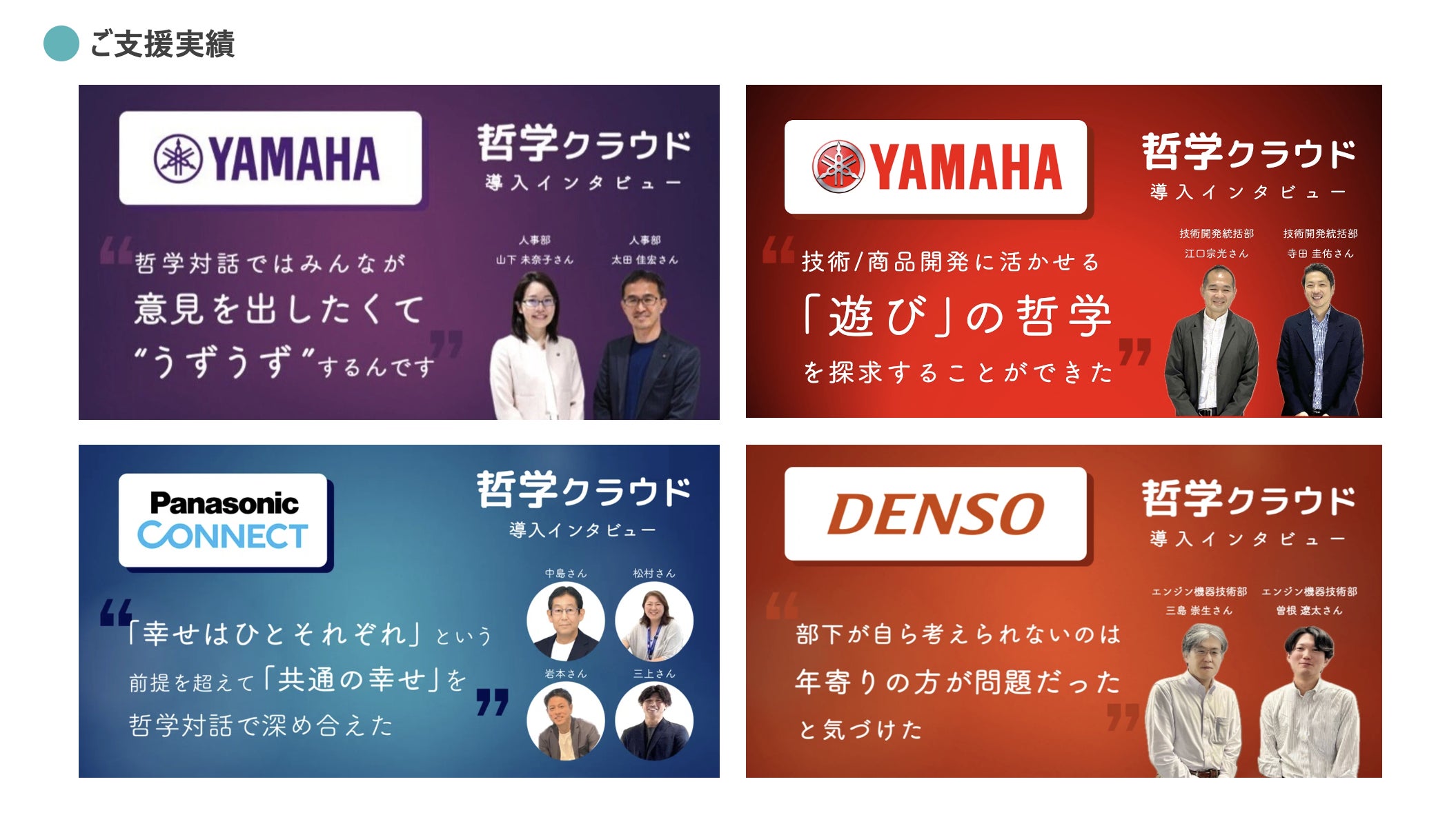 これまで、大手メーカーを中心した日本のエンタープライズ企業に、哲学を活用したご支援をしてまいりました。(弊社 事例noteページ)