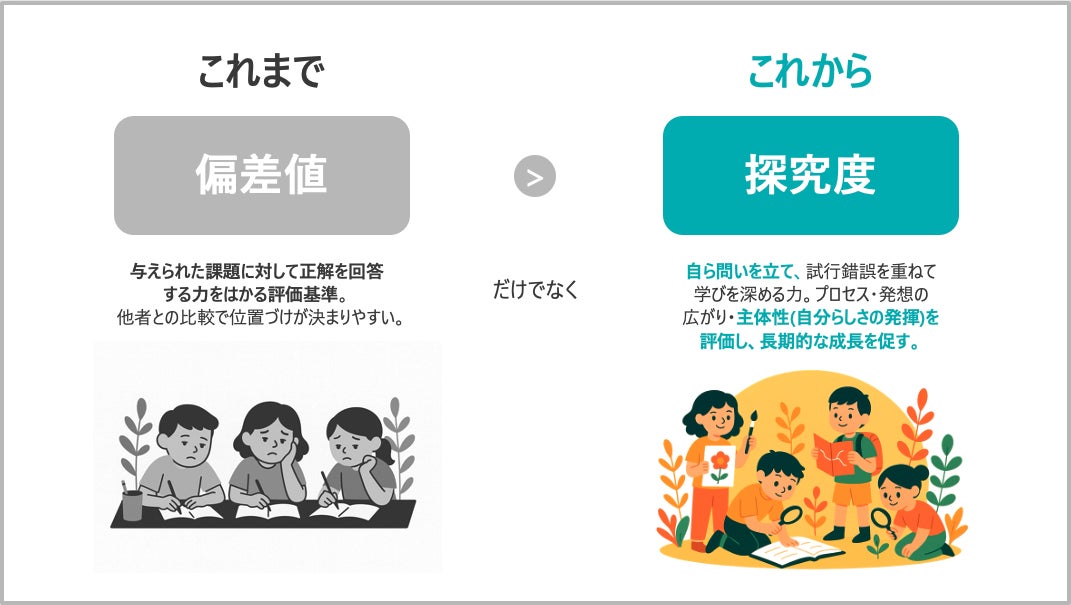 与えられた問いに対して解を出す力を測る「偏差値」ではなく、自ら問いを立てる力や考える力、自己省察などのレベルを定義して自分らしさを形づくるための「探究度」を設定。新たな指標に基づいて、偏差値のみにとらわれない学習・探究機会を設けられるようにし、教育を通して自分らしさを発揮する機会を増やします。