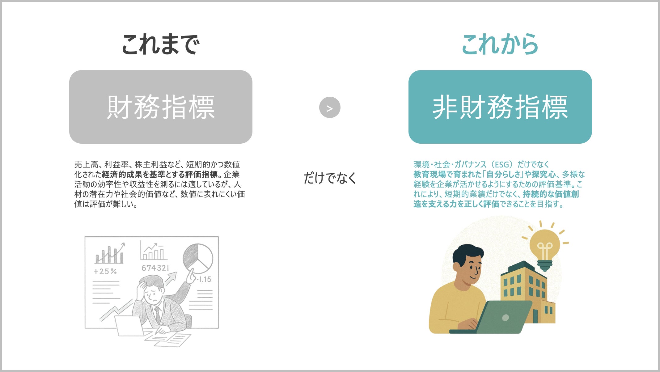 しかし現状は、計測しやすい領域から着手する傾向が強く、教育によって「自分らしさ」や探究心、多様な経験に基づく視点を育むことができたとしても、その価値が企業の中では見過ごされ続けるリスクがあります。