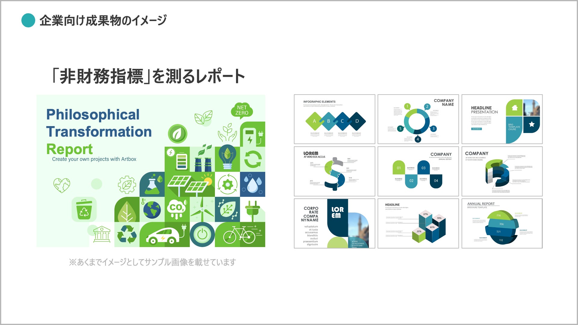 私たちは、これまで培ってきた哲学をビジネスに活かす技術を活用して、こうした見えにくい価値を可視化し、企業評価の新たな軸として統合します。そして、事業の文化的価値や社会的価値などの「非財務指標」と「探究度」の関連を探索し、コンサルティングや対話型ワークショップを通じて指標や言語を社内に根付かせ、「測る」だけではなく「育てられる」状態をつくり、評価と学習のサイクルを回していきます。