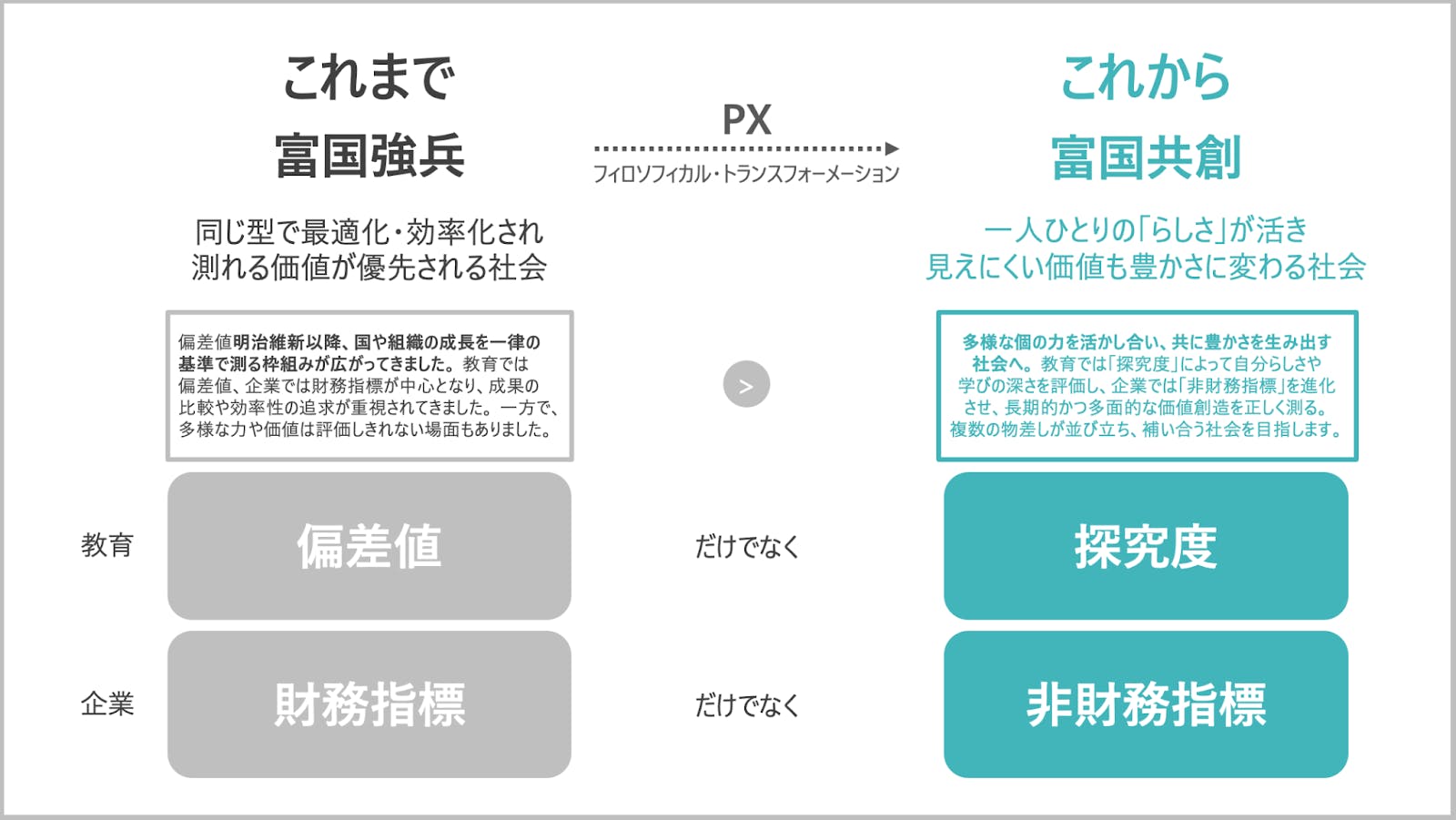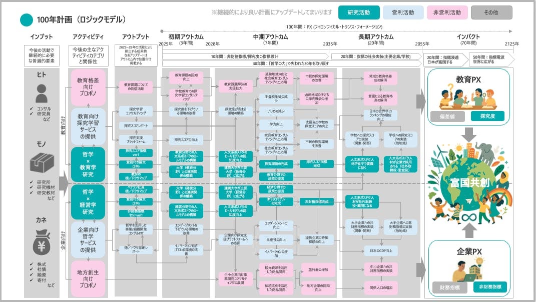 ここで詳細は割愛しますが、100年計画の骨格は博士・研究者の知を社会に接続し、モノサシそのものを更新します。左の資源(ヒト/モノ/カネ)を基盤に、研究・営利・非営利の活動を束ね、中央のアウトプットで「探究 度(教育)と非財務指標(企業)」を定義・測定・可視化します。その「測れる新常識」がアウトカム(初期→中期→長期)へ連鎖し、最終的「教育PX(偏差値→探究度)と企業PX(財務→非財務指標)」が合流して、富国共創という社会インパクトに至ります。