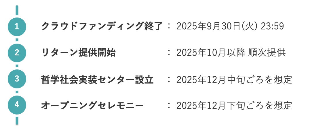 2025/10/06 09:55皆さまこの度は「未来のモノサシ」をつくる「哲学社会実装センター」設立プロジェクトにご支援・応援をいただき、誠にありがとうございました。今回、当初の目標金額1000万円には届きませんでしたが、第二ゴールとして設定した100万円に対しては125%となる125万5000円ものご支援を賜りました。何より、90名もの方々が「哲学を社会に実装する」という大きな目標に共感し、期待をお寄せくださったことが本当に嬉しく、この活動の意義を感じてくださる方がいることに勇気をいただきました。さて、哲学社会実装センターの活動はここからが本番です。まずは、ご支援いただいた皆さまに向けて、お選びいただいたリターンをお楽しみいただけるよう準備を進めてまいります。リターンの一つ一つが哲学の社会実装につながる活動となっておりますので、ぜひご参加いただき、仲間としてこの取り組みを体感していただければ幸いです。各種講座については来年1~3月を目処に受講いただける予定です。少し期間が空きますが、日程等の詳細は事前にご連絡させていただきます。引き続き、未来のモノサシづくりの活動を応援いだけますと幸いです!今後ともどうぞよろしくお願いいたします。哲学クラウド もっと見る