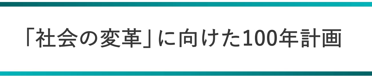 心強い仲間と共に目指すビジョンですが、夢物語で終わらせるつもりはありません。本気で抜本的な「社会の変革」を目指すなら5年や10年で達成は正直いって難しいでしょう。だからこそ私たちは地に足をつけて、100年間というスケールで、段階的にモノサシをつくり、社会実装していく計画(ロジックモデル)を描いています。