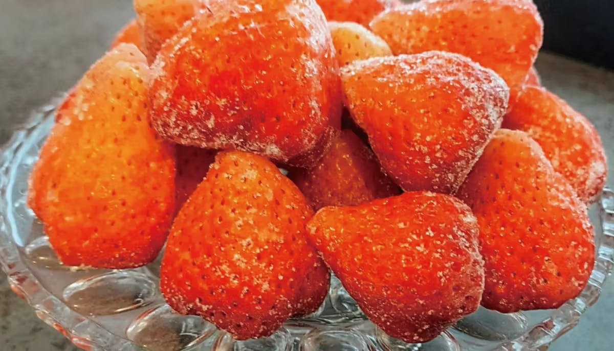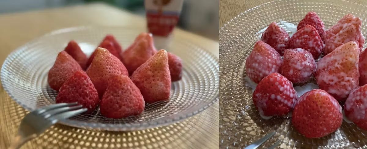 早く食べたい気持ちを抑え、まずは冷蔵庫で半解凍。私は1時間くらい半解凍しました。お皿に盛り付けるといちごについた氷がキラキラと輝いていて作られた越後湯沢の雪みたい‼
