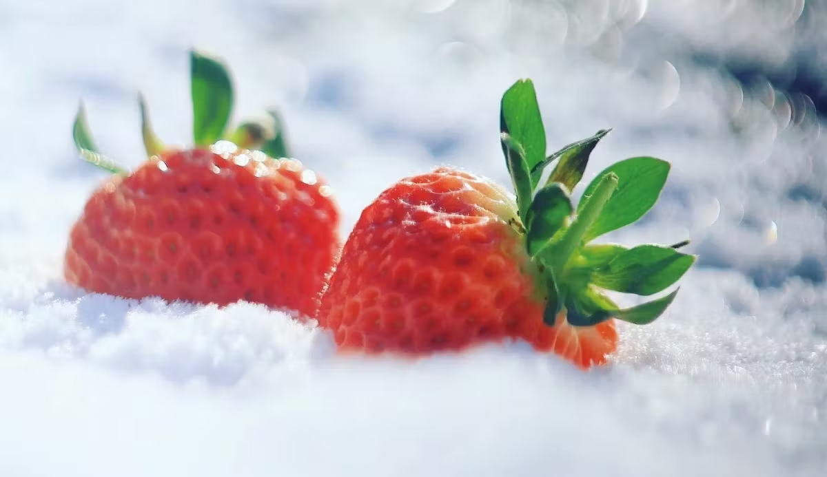 お皿に盛り付けるといちごについた氷がキラキラと輝いていて
