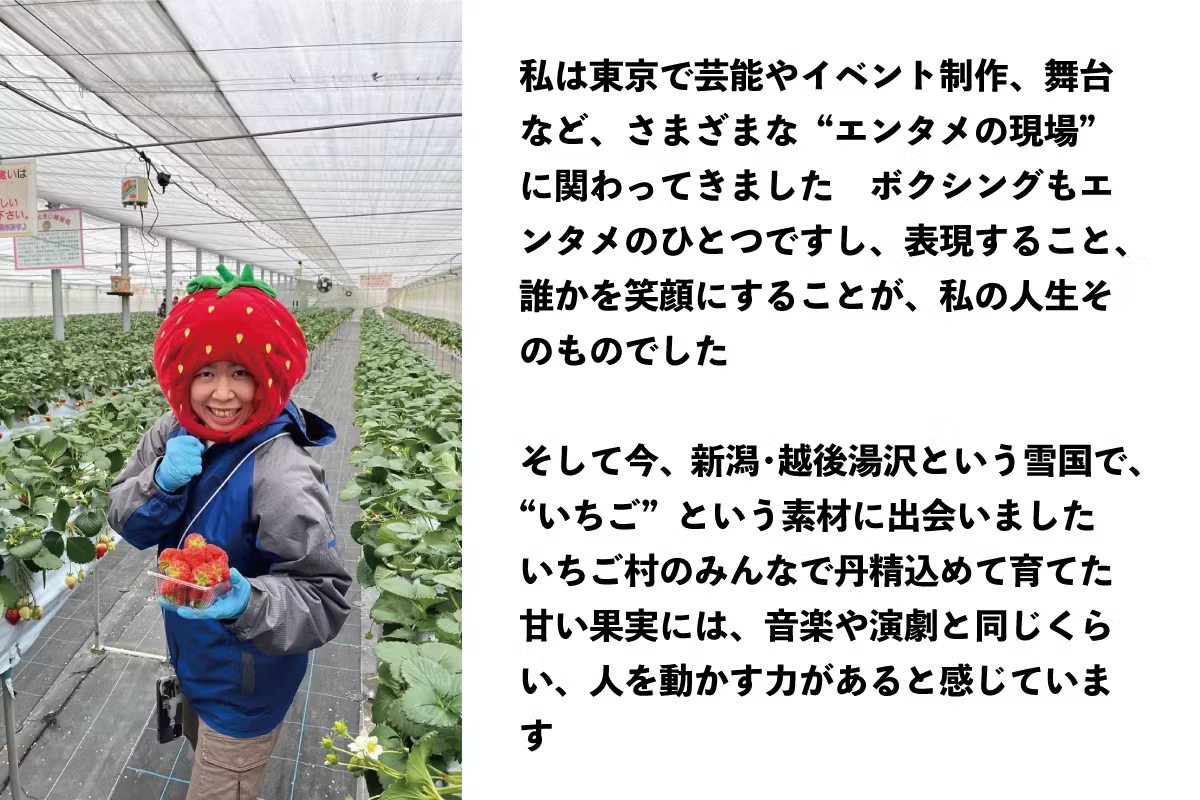 元ボクサーとして東京でエンタメの現場に関わってきた私は、越後湯沢に移住し、娯楽の少なさや地域資源の埋もれ方を痛感しました この冷凍いちごプロジェクトは、ただの商品ではなく、地域に“わくわく”を届ける最初のエンタメ企画です いちごをきっかけに、この町にもっと笑顔が増える未来を目指します